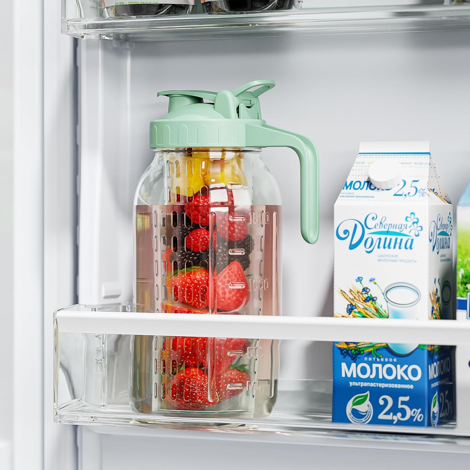 - Stylish Look & Ergonomic Handle: The clear design lets you see the bright colors of your drinks and fruits. The ergonomic handle supports a full jar, allowing easy pouring and fridge storage with volume markings for precise intake.
