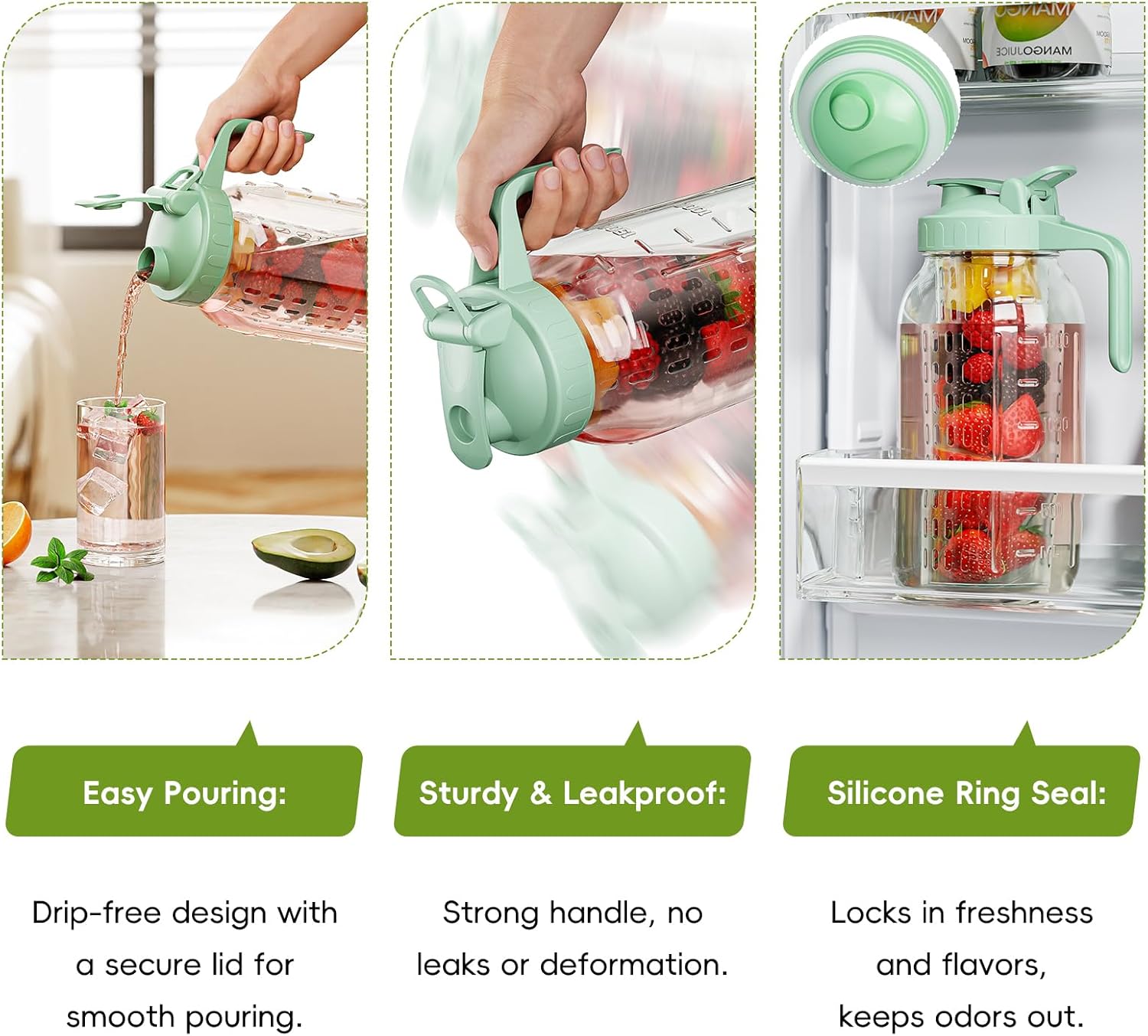 - Fruit Infuser Design: This 64oz mason jar pitcher is specifically crafted for those who enjoy fresh and flavorful drinks. The infuser allows for the effective release of flavors and nutrients from fruits and tea leaves, ensuring each sip is bursting with natural goodness.