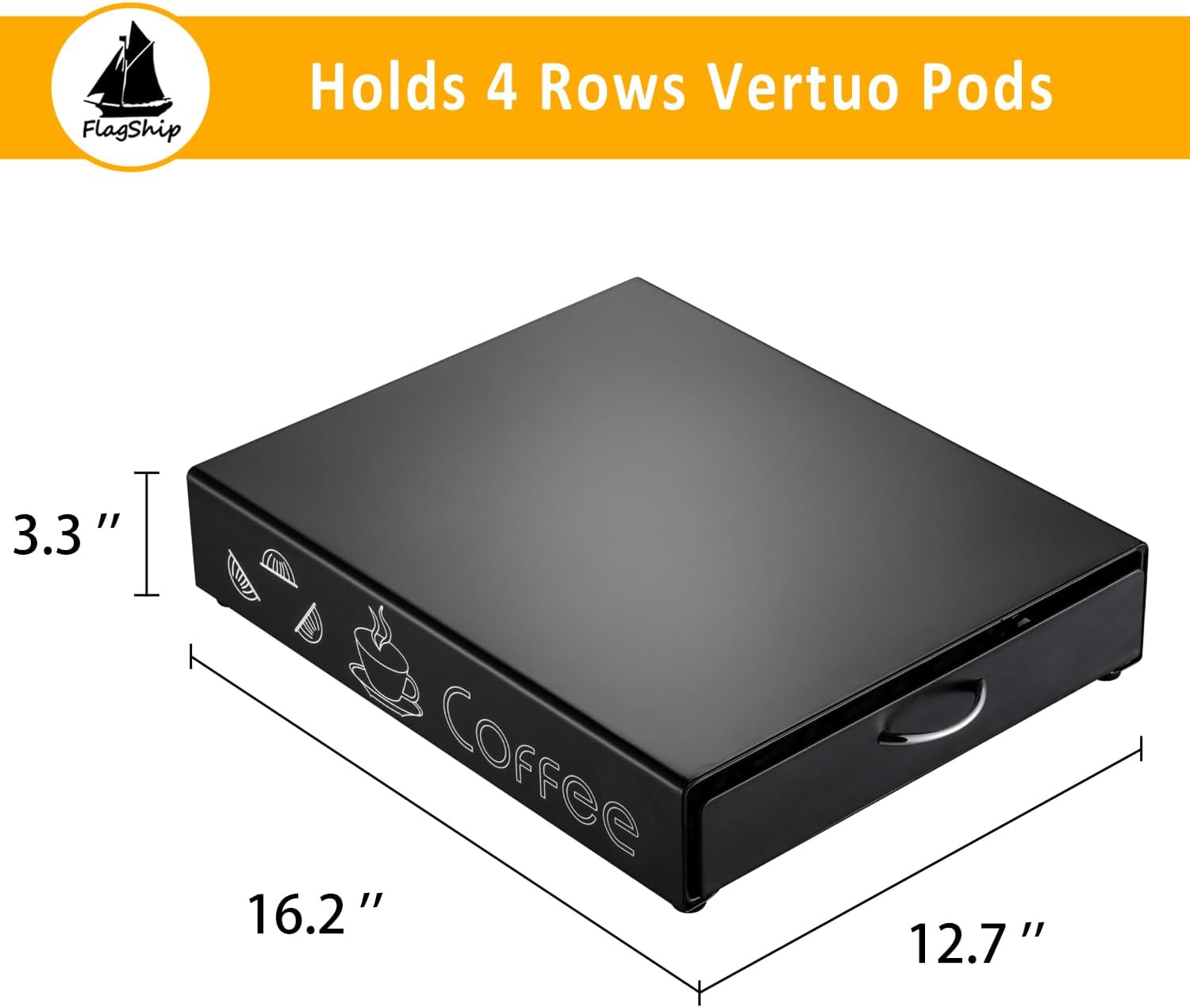 - 【Ultra-Large Capacity】 Universal design drawer,Flagship's latest Pod drawer easily fits all sizes of Vertuo capsules.Maximum Capacity: (40 pods 12/18 oz) or (55 pods 7.8/5/2.7oz) or (80 pods 1.35oz)