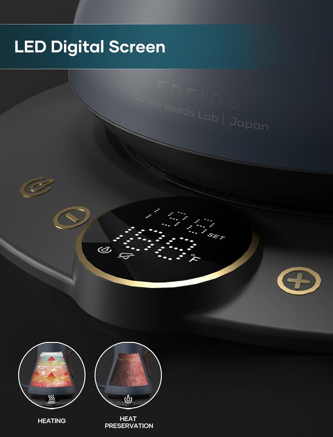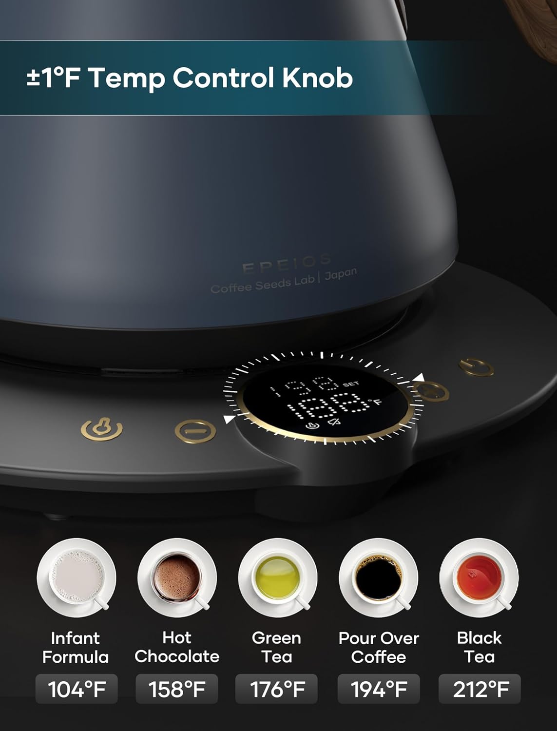 - ±1℉ Temperature Accuracy - The intelligent base's built-in temperature control program. The program will adjust the heating power when the water temp approaches the desired temp according the temp probe detects the temp change.
