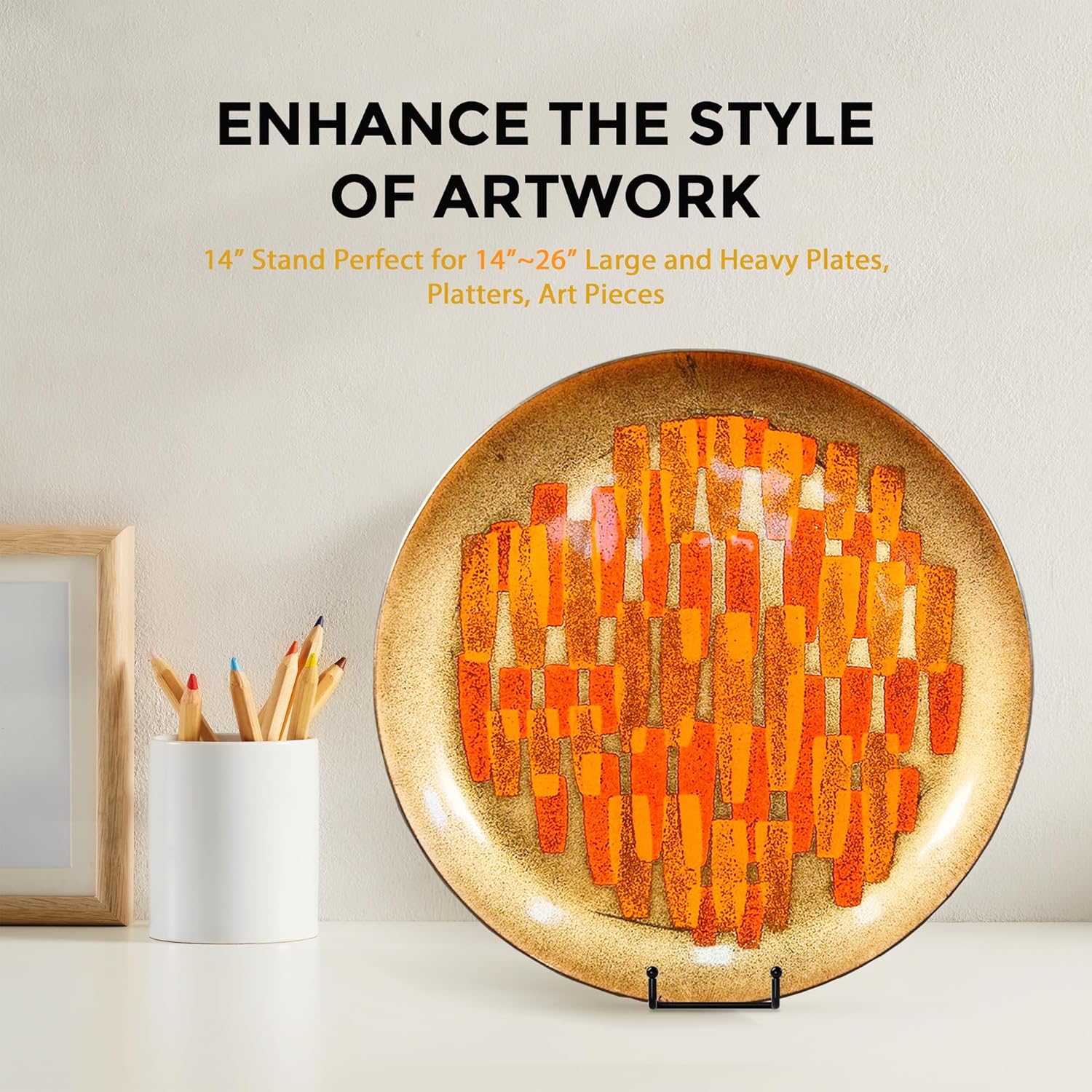 - Versatile 14-Inch Plate Holder Stand: Sturdy design with a 2.75-inch deep lip, 10° tilt angle, and 4-inch wide base securely holds items from 14 to 34 inches and up to 20 lbs, ideal for tall plates, picture frames, posters, signs, and platters