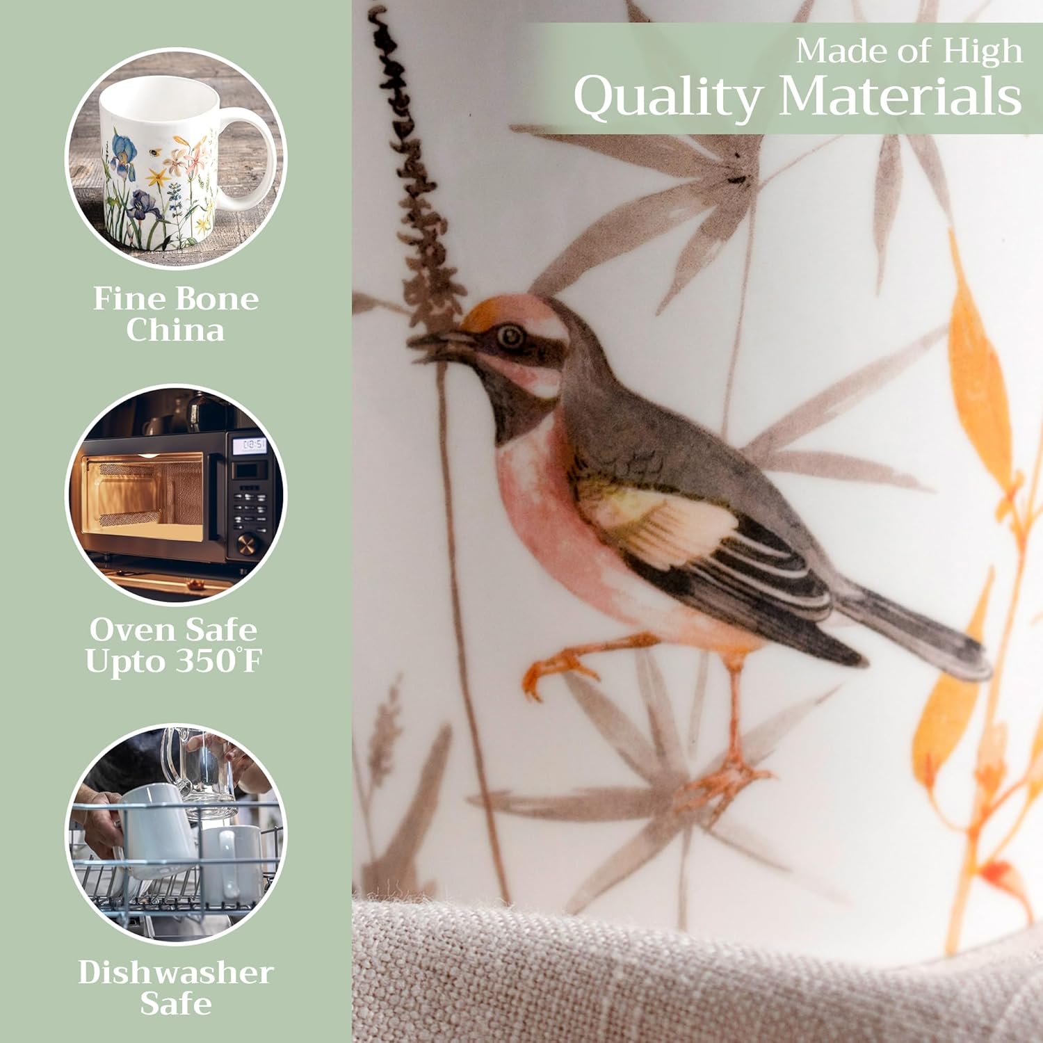- Easy Care & Maintenance: Microwave, dishwasher, and oven safe up to 350°F. These bone china mugs are built for convenience and durability, making cleanup and reheating simple without compromising on quality