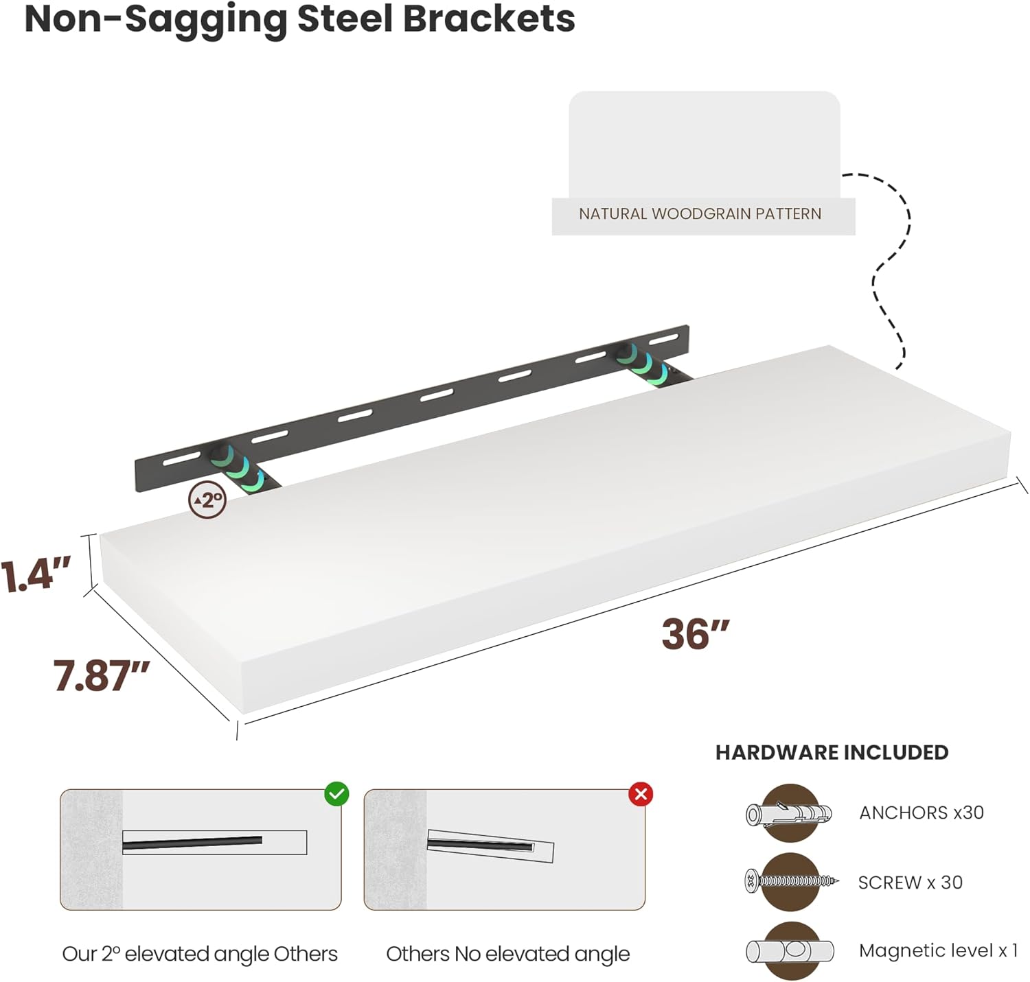 - Easy To Install: Our Toro hidden mounting bracket was designed to line up with 36" framing studs on center and sit Flush-To-Wall. A set of 2 wide floating wooden shelves for wall includes instructions, magnetic level, self-tapping drywall anchors, and screws. This is great because you can easily mount these rustic shelves Gap-Free to any surface in less than 5 minutes!
