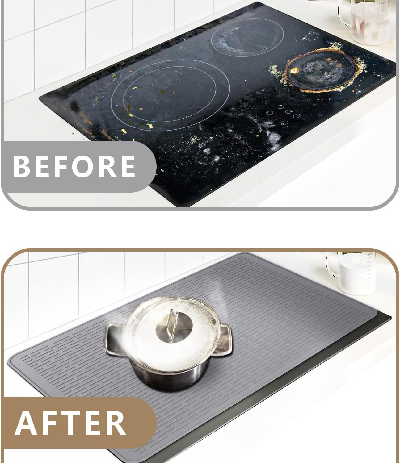 - Ultimate Protection: This extra-large silicone dish drying mat and stove top cover protects surfaces such as glass top stoves, kitchen countertops, electric cooktops, stove gap covers and washer-dryer tops from scratches, spills, stains, scrapes, and dirt. The stove top covers for electric stove are apartment must haves and home essentials for any modern kitchen.