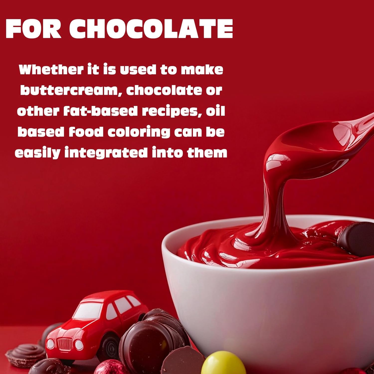 - Oil based Food Coloring: Compared to liquid or gel food coloring, oil based food coloring is designed to blend perfectly with high-fat foods like chocolate, candy and cream. It won't cause your chocolate to harden or clump, ensuring a smooth and seamless integration. Create stunning works of chocolate art with ease.