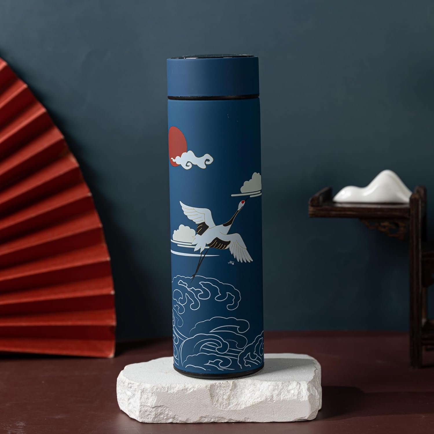 Insulated Coffee Tea Travel Thermos Mug Water Bottle with Removable Strainer and Temperature Featuring Elegant Asian Art Design - 16.9 fl oz (Blue)