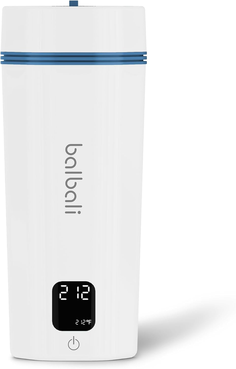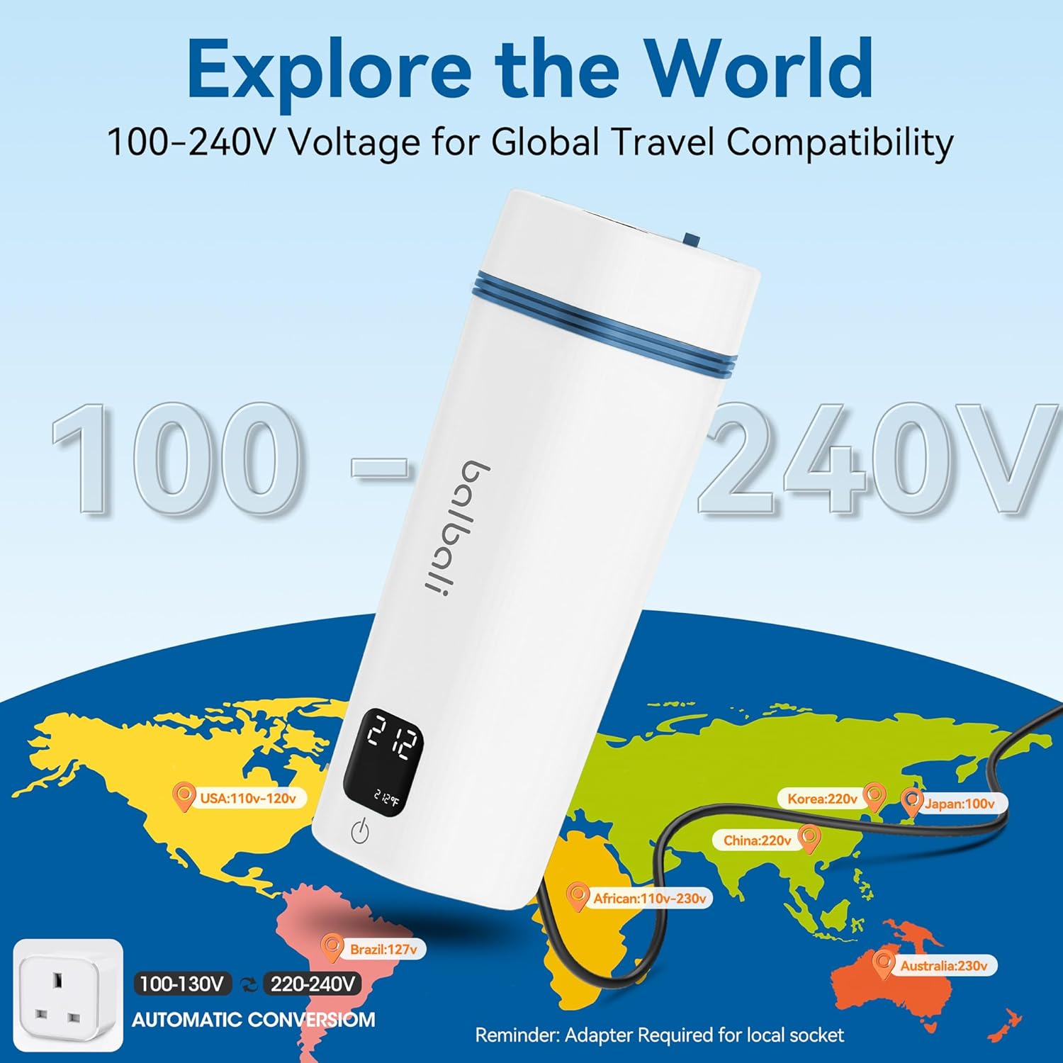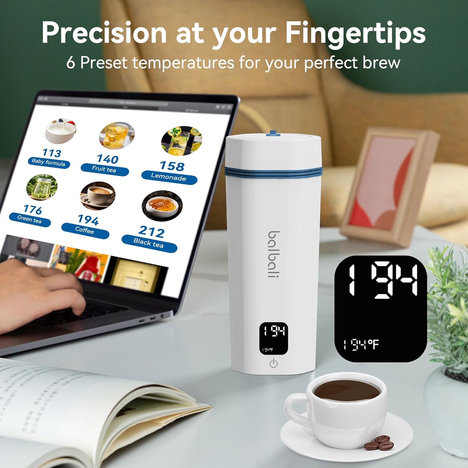 balbali Portable Tea Kettle for Travel 100-240V Dual Voltage - 6 Preset Electric Portable Water Heater for Boiling - Self Heating Cup/Thermos - 12oz Hot Water Boiler/Heater/Warmer - White
