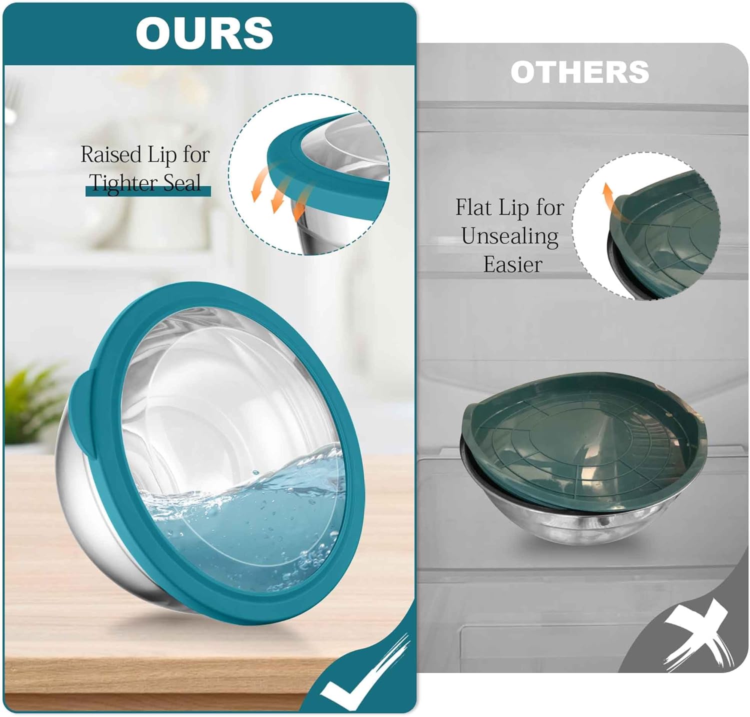 - NON-TOXIC & HEAVY DUTY: Our mixing bowls are made of pure stainless steel without any toxic coating or harmful substances and the airtight lids are constructed by food grade plastic and silicone, No chemical substances leaching when during food preparation, Healthy for everyday use, Sturdy stainless steel to avoid rust and deformation, For a longer service life