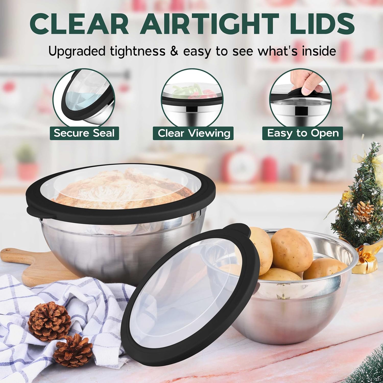 - Healthy & Durable: mixing bowls are made of quality stainless steel to prevent rust, dents and offer reliable durability, transparent lids are crafted of food-grade plastic and silicone for healthy use