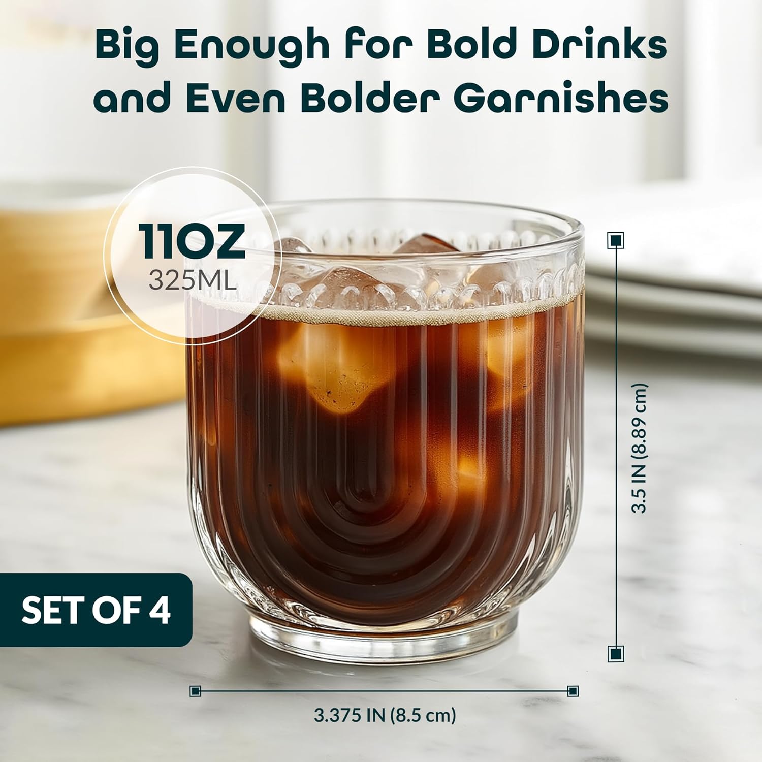 Glaver's Whiskey Glasses 11oz. Set of 4 Old Fashioned Bourbon Glasses. Ribbed Cocktail Arch Design Art Deco Bar Glassware for Whisky, Cocktails, Juice and Chilled Beverages.