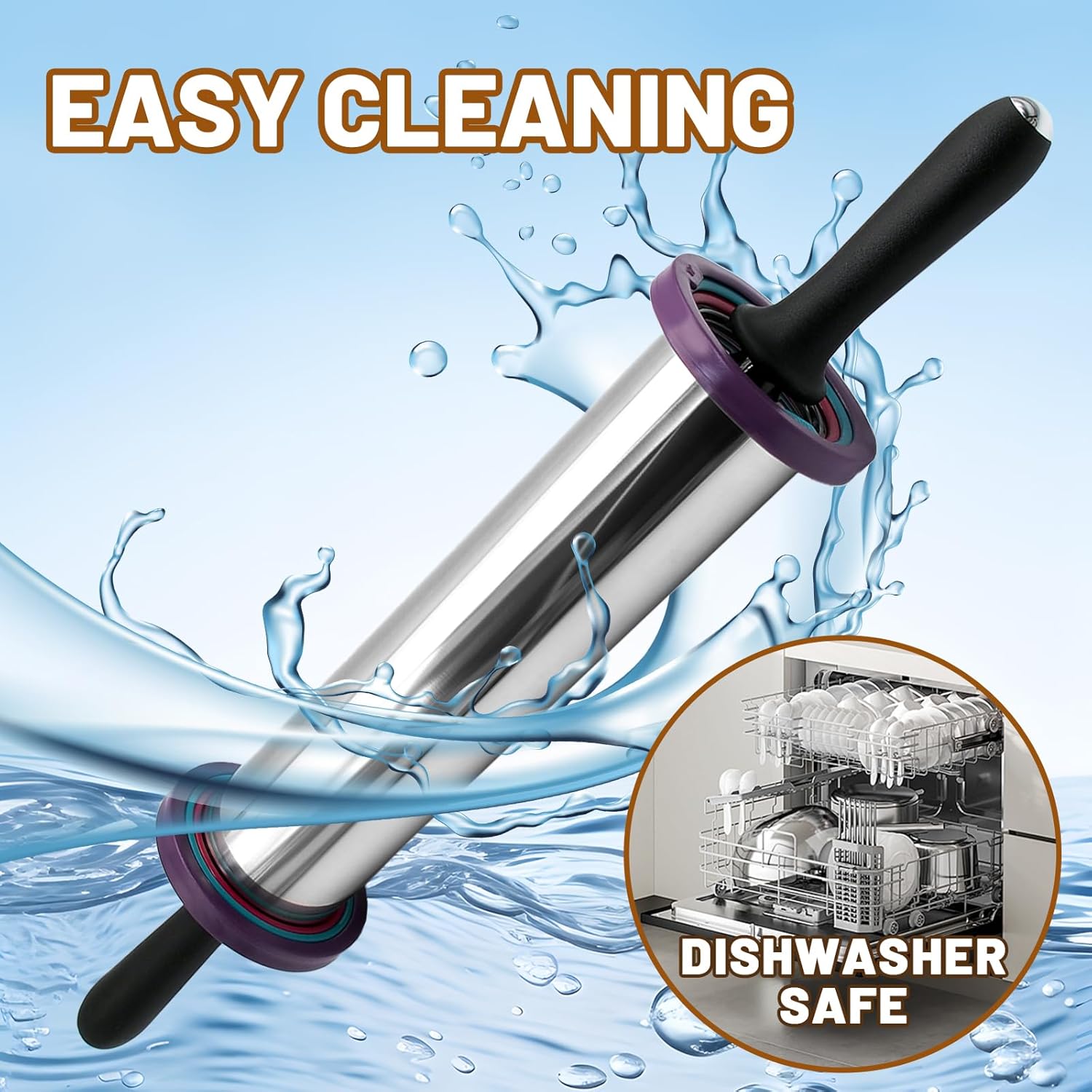 - Adjustable Rollig Pin: Adjustable Rolling Pin with Thickness Rings have 3 sizes of detachable rings: 1/2, 1/4 and 1/8 inch are used to knead the dough to the expected thickness easily of cooking. The stainless steel rolling pin in can be used to create any mixture you can imagine, such as pizza and pie, egg tart, bread, cookie, dumpling, pancake, pastry and other foods. And moreover you can teach your children to bake in the kitchen with it