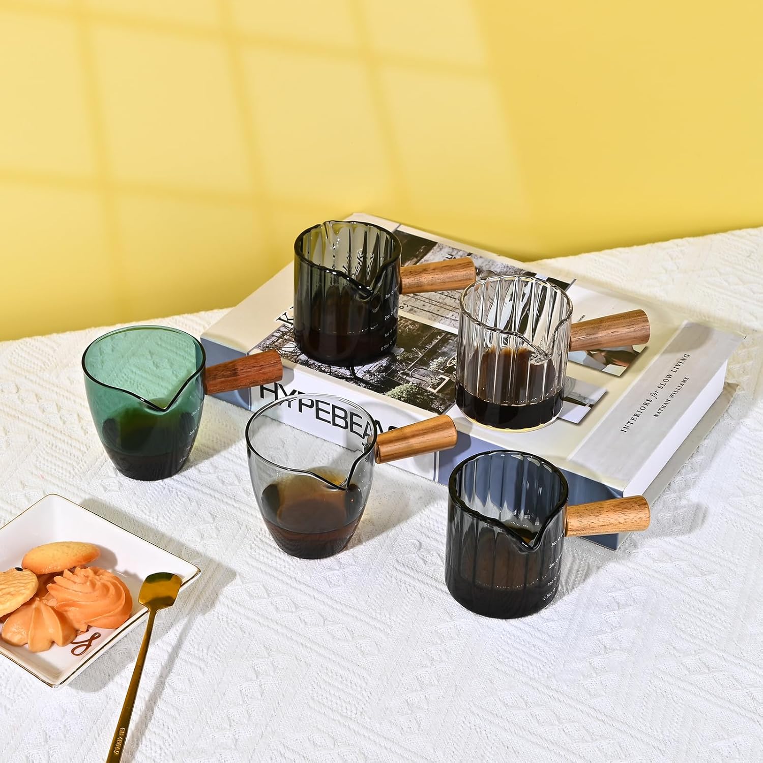 Glass Measuring Cup, 3oz Espresso Shot Glass with Wood Handle, Single Spout Measuring Cups Pitcher Milk Cup Coffee Shot Glasses (Gray Ribbed)