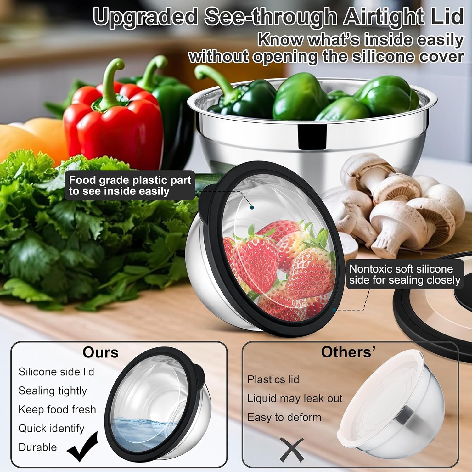 - UPGRADED AIRTIGHT CLEAR LIDS: The bowl's cover is compose of transparent plastic middle part and silicone edge, This design helps to quickly identify the food inside without opening the lid, Silicone side can seal tightly, No more worry of spilling and leaking, Make sure that less dust enters the bowl and lock the freshness, Suit for storing leftovers in the refrigerator, Take them as containers for serving food, The roll-rimmed edge and lid help to easily carry food for camping or picnics, Convenience to your daily life