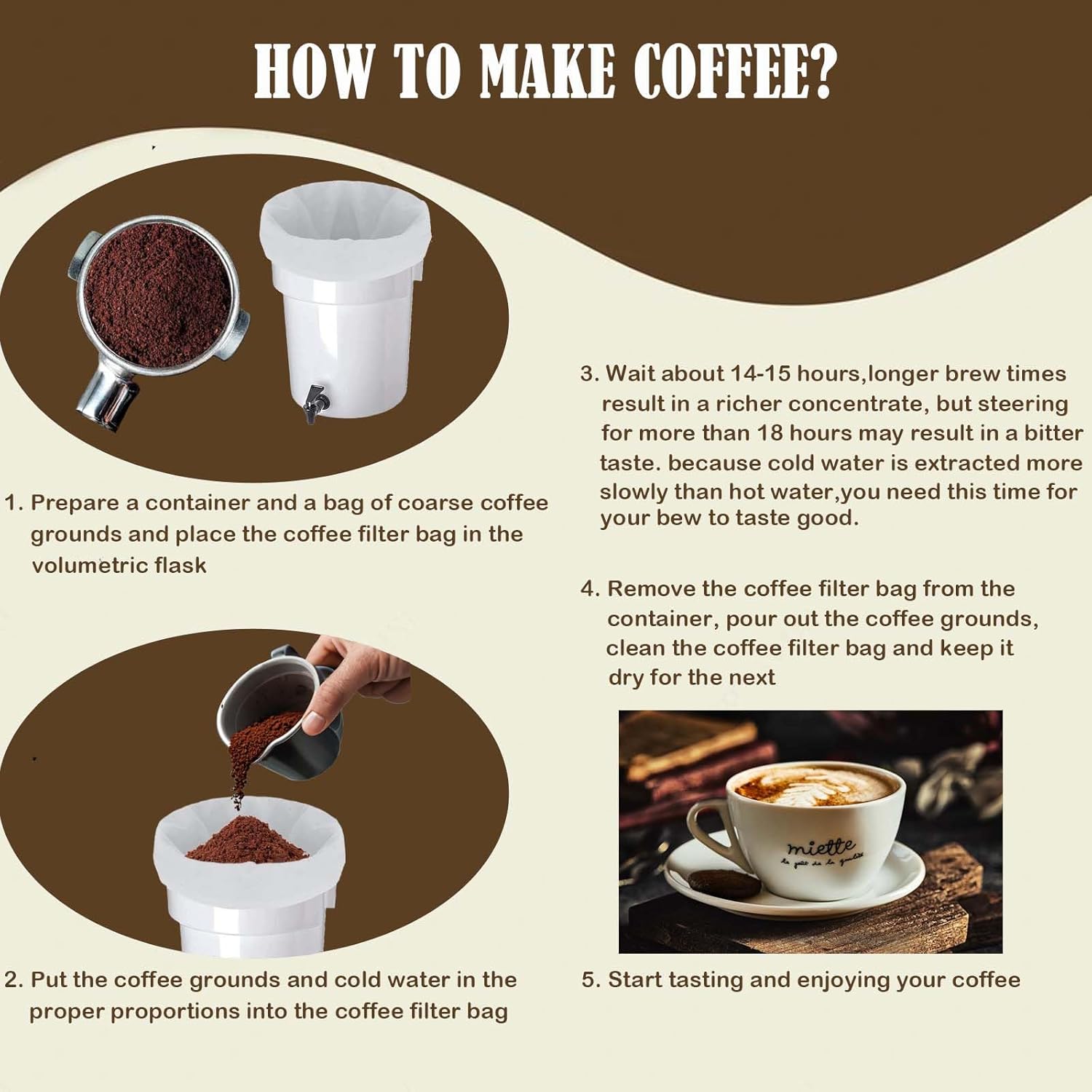 - DISPOSABLE AND MESS-FREE: Our convenient disposable coffee filters simplify the process. Simply drop the cold brew bags into a 3-5 gallon bucket, add coffee and water and secure the drawstring for an overnight steep. The following day, indulge in rich espresso-style coffee served over ice straightaway. Disposing of the brew bag along with the coffee grounds is hassle-free, eliminating the need for cleanup