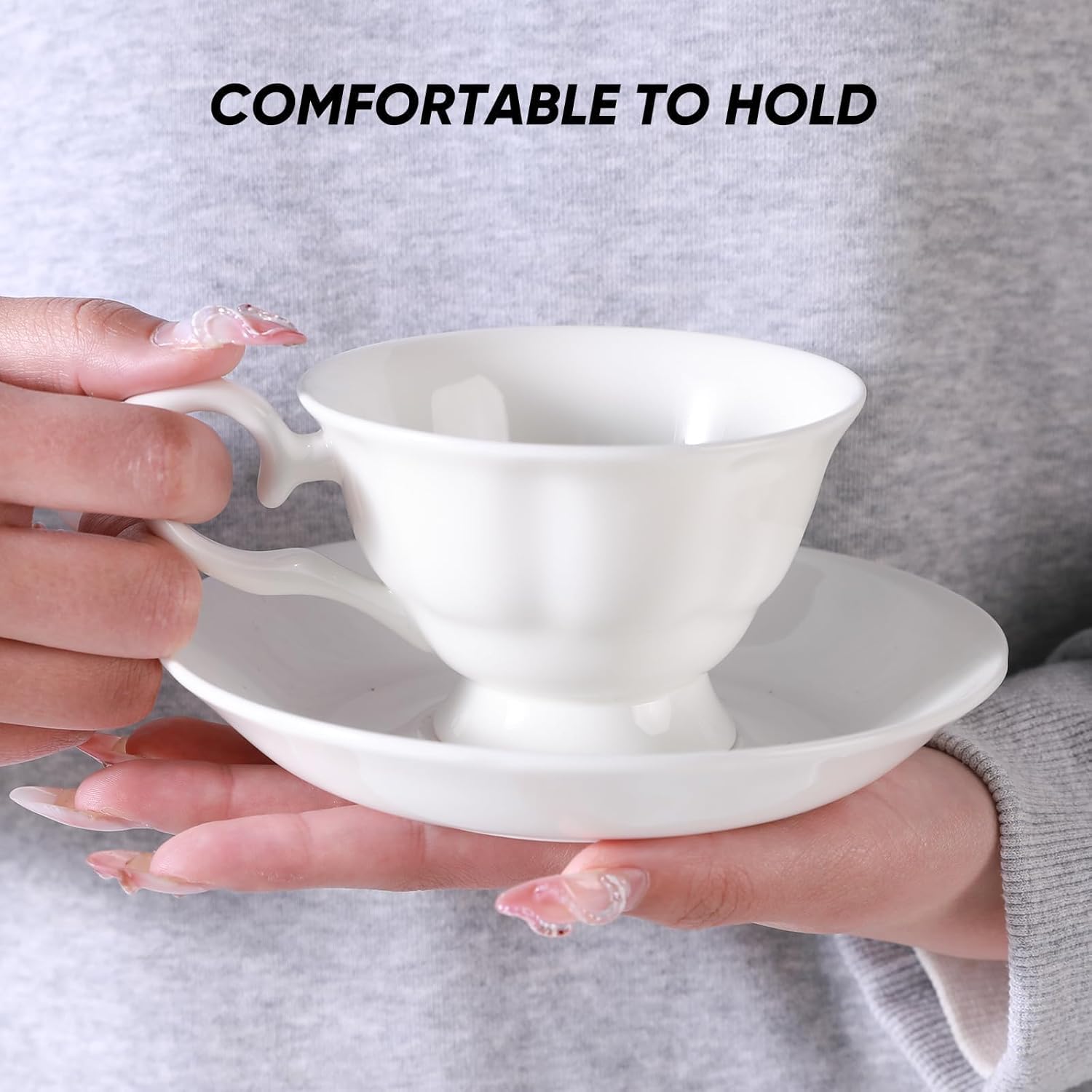 - [Anti-Slip Design] This elegant tea cup and saucer set comes with a matching non-slip saucer to ensure the fine bone china tea cup fits perfectly, providing stability and preventing accidental slips or spills. The 4oz vintage porcelain teacup is exquisitely crafted and easy to carry, making it perfect for afternoon tea or sharing delightful moments with family and friends