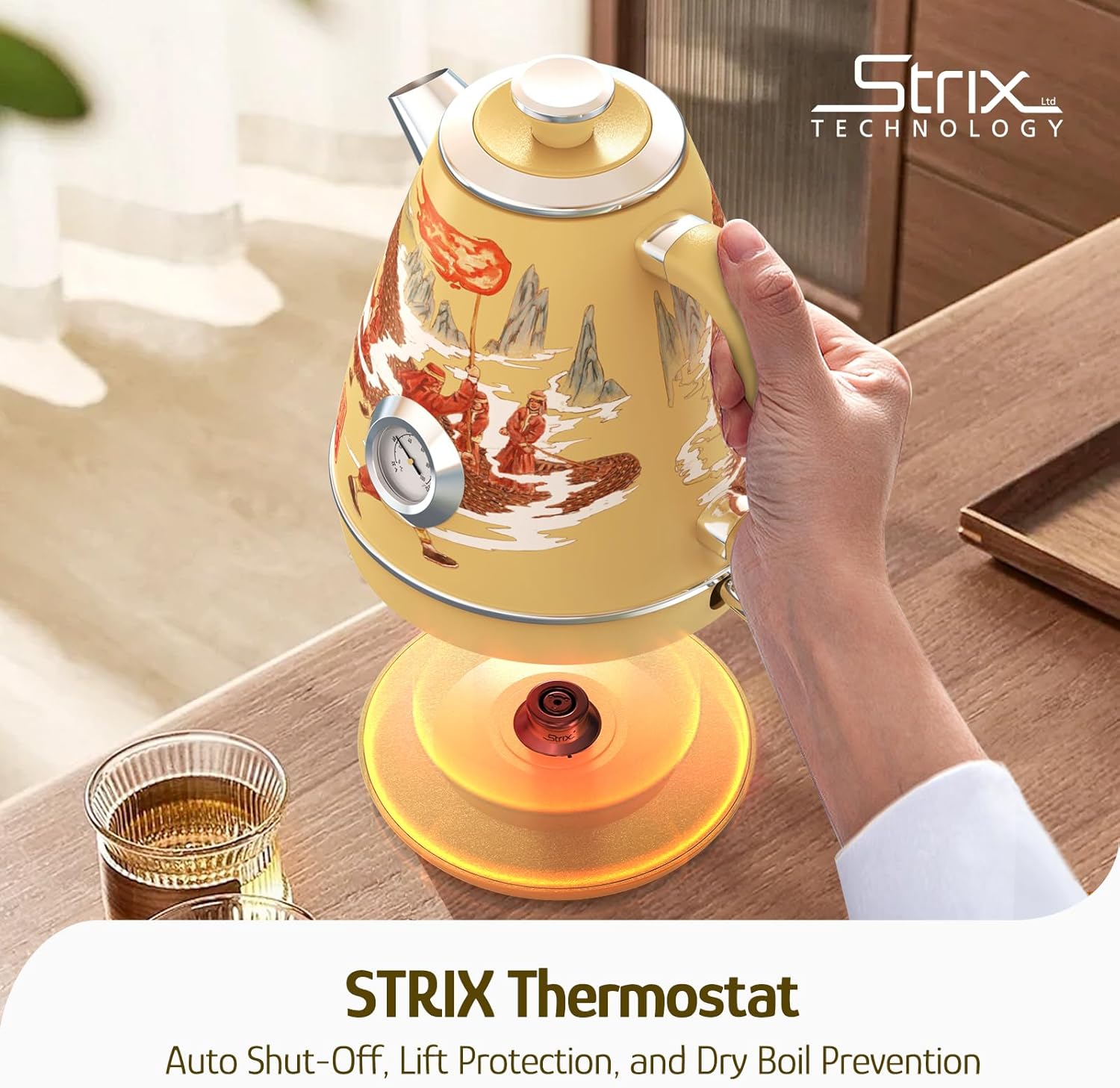 Hazel Quinn Retro Electric Kettle - 1.7 Liters / 57.5 Ounces Tea Kettle with Thermometer, All Stainless Steel, 1200 Watts Fast Boiling, BPA-free, Cordless, Automatic Shut Off - Dragon Dance