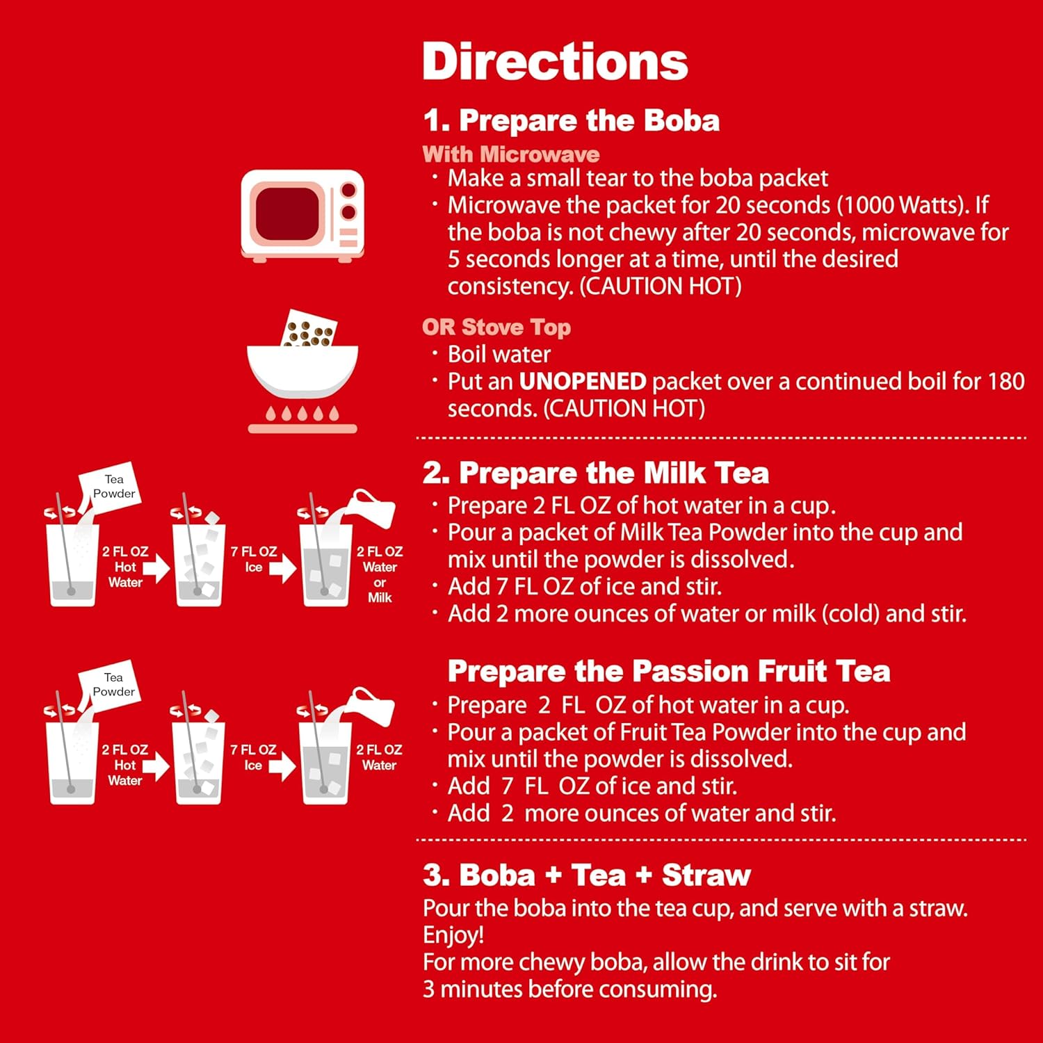- READY IN UNDER 1 MINUTE - Our boba is made from preservative free instant tapioca pearls coated in brown sugar syrup. Microwave the boba packet, add hot water to milk tea powder in a cup, and add ice, heated boba, and straw. Yay it's done!