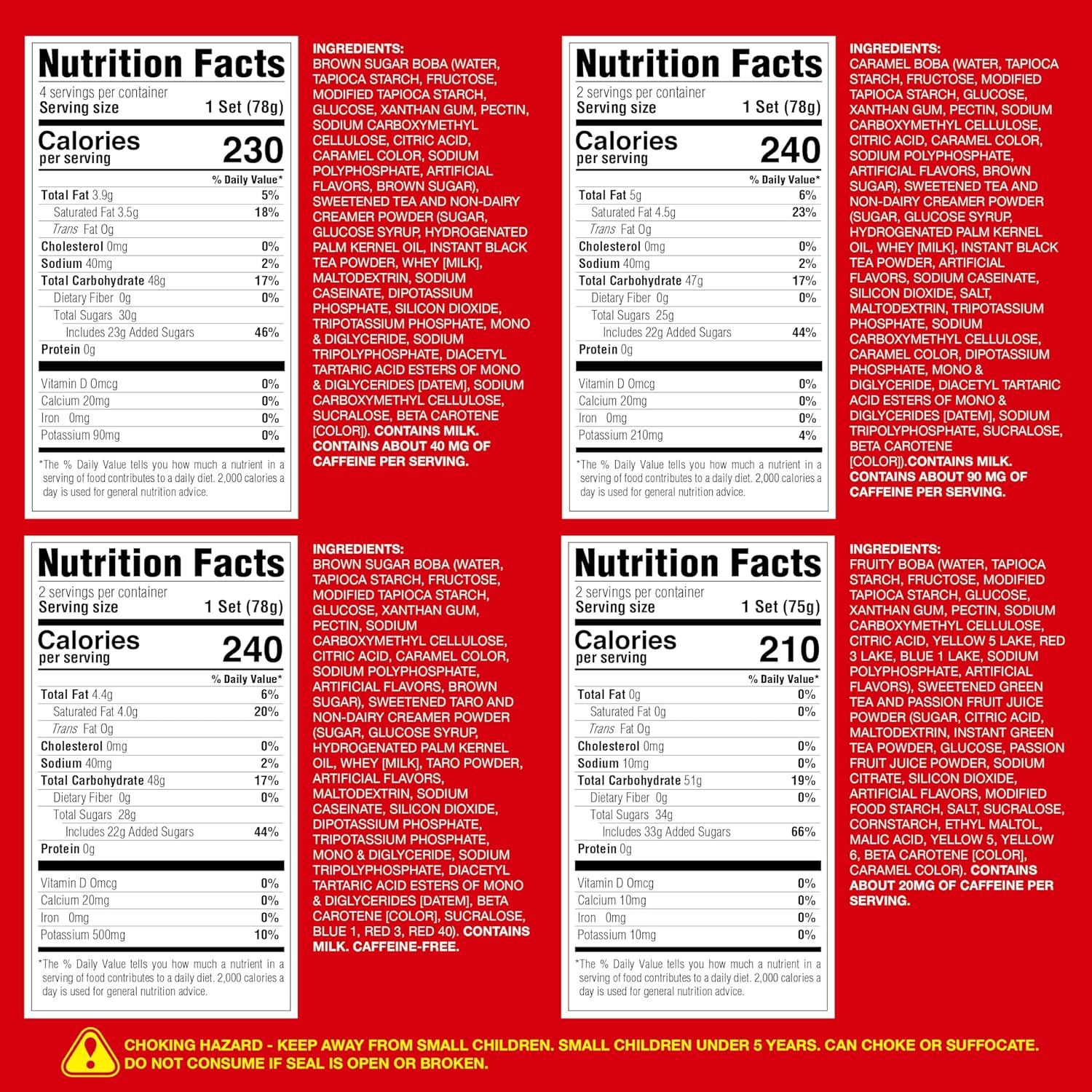 - WHAT IS INSIDE – 6 packs of brown sugar boba, 2 packs of caramel boba, 2 packs of fruity boba, 4 classic milk tea packets, 2 taro milk tea packets, 2 creme brulee milk tea packets, 2 fruit tea packets, and 10 extra wide paper straws.