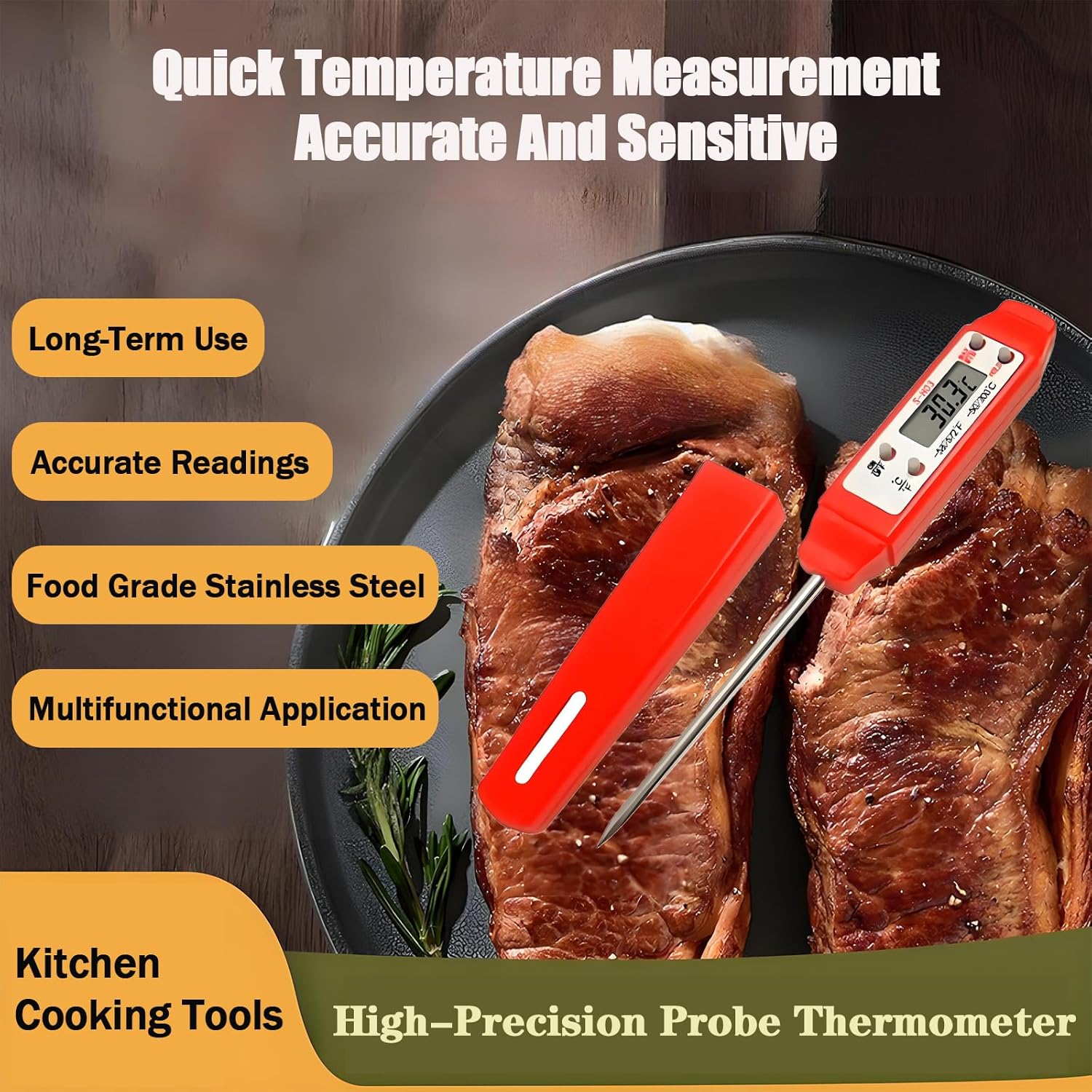 - VERSATILE APPLICATIONS: The meat thermometer is ideal for various cooking needs, including meat, liquids, frying, and candy making, providing a versatile tool for all your culinary endeavors. Simply insert the probe into the food or liquid and wait 2~3 seconds for the final temperature to be displayed.