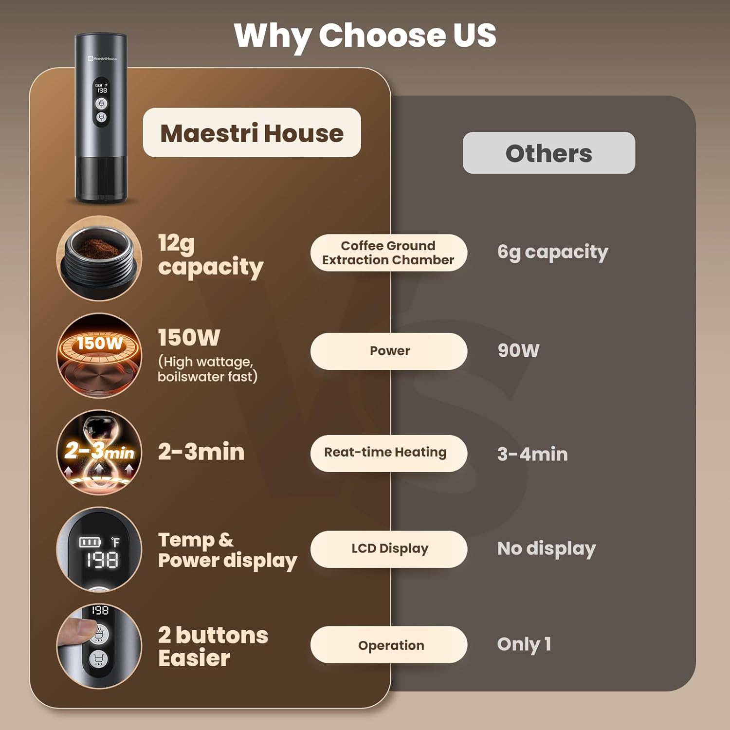 Maestri House 150W Espresso Maker with 2-3 Min Fast Self-Heating, Portable Travel Espresso Coffee Machine with Bag, Small Tea Cup Also Holder for NS Capsule & Ground Coffee for Car Camping, RV, Hiking