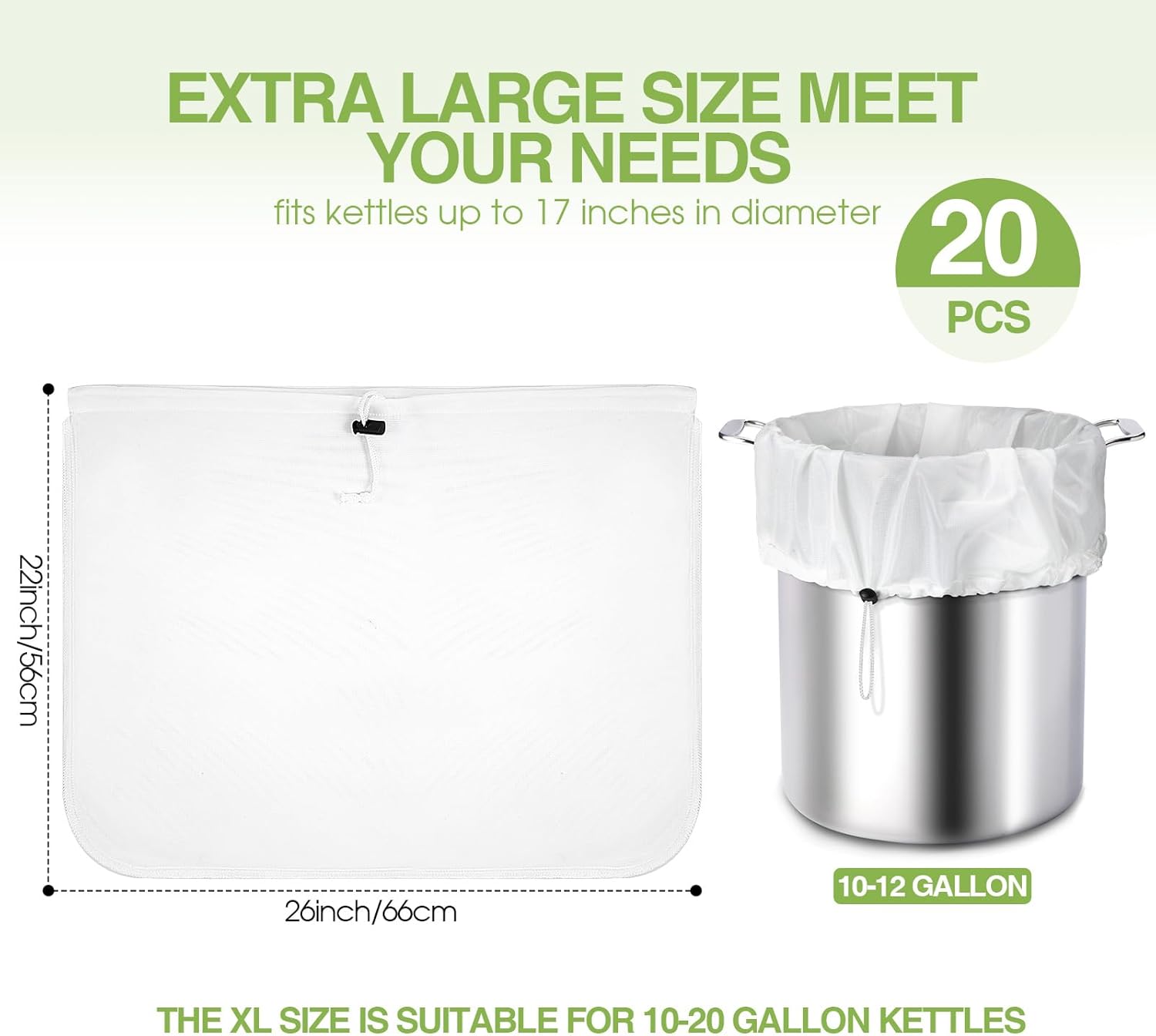 - Extra Large Size: the strainer bag size is 66 x 56 cm/ 26 x 22 inch which ensure you can brew even the largest of recipes without spilling any grain. It will fit different kettles up to 17 inches in diameter. It can also satisfy for versatile needs such as jelly strainer, cider press, grape press, nut milk bags, this cold brew bags can do it all