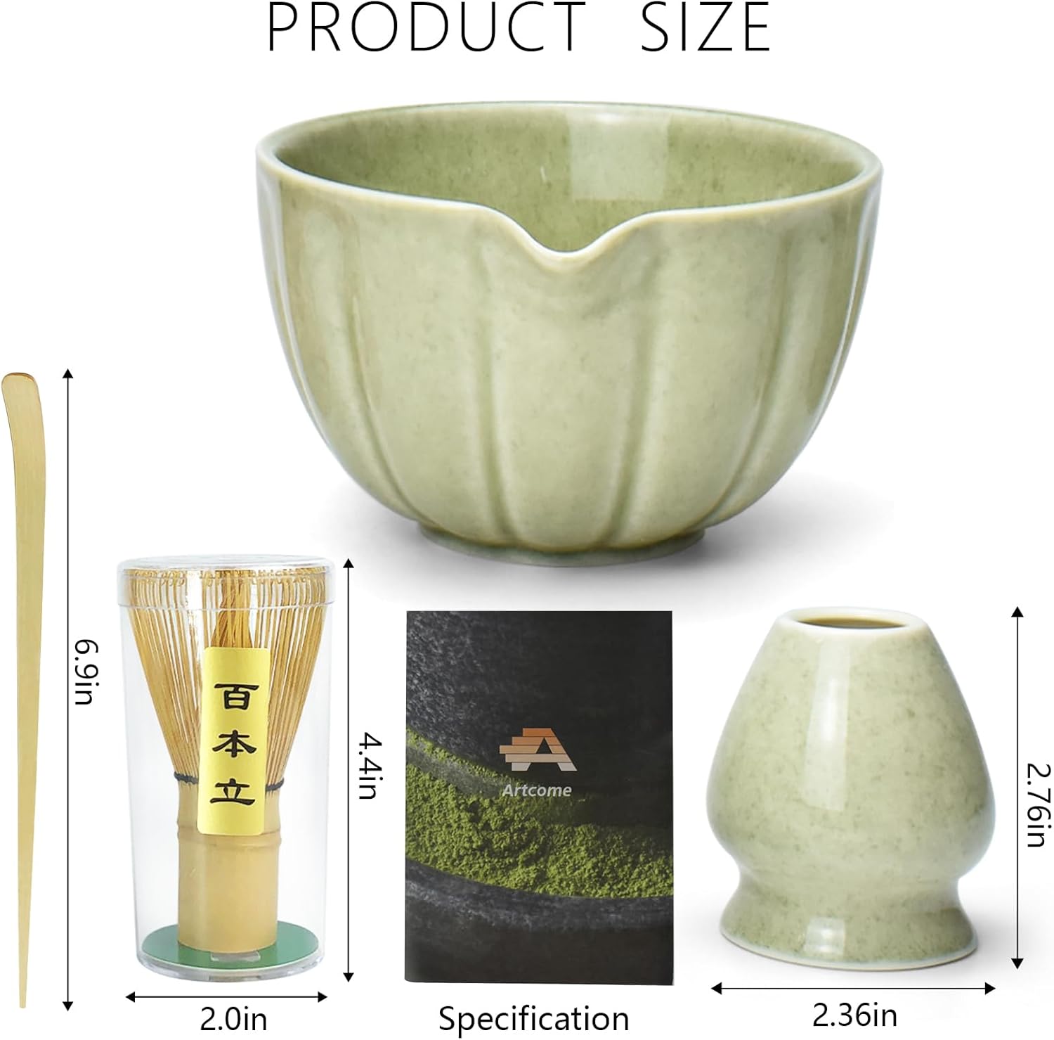 Artcome 4 Pcs Japanese Matcha Tea Set - Matcha Bowl with Pouring Spout, Matcha Whisk, Tea Scoop, Whisk Holder, Handmade Matcha Ceremony Kit For Japanese Tea Ceremony, Mottled Green