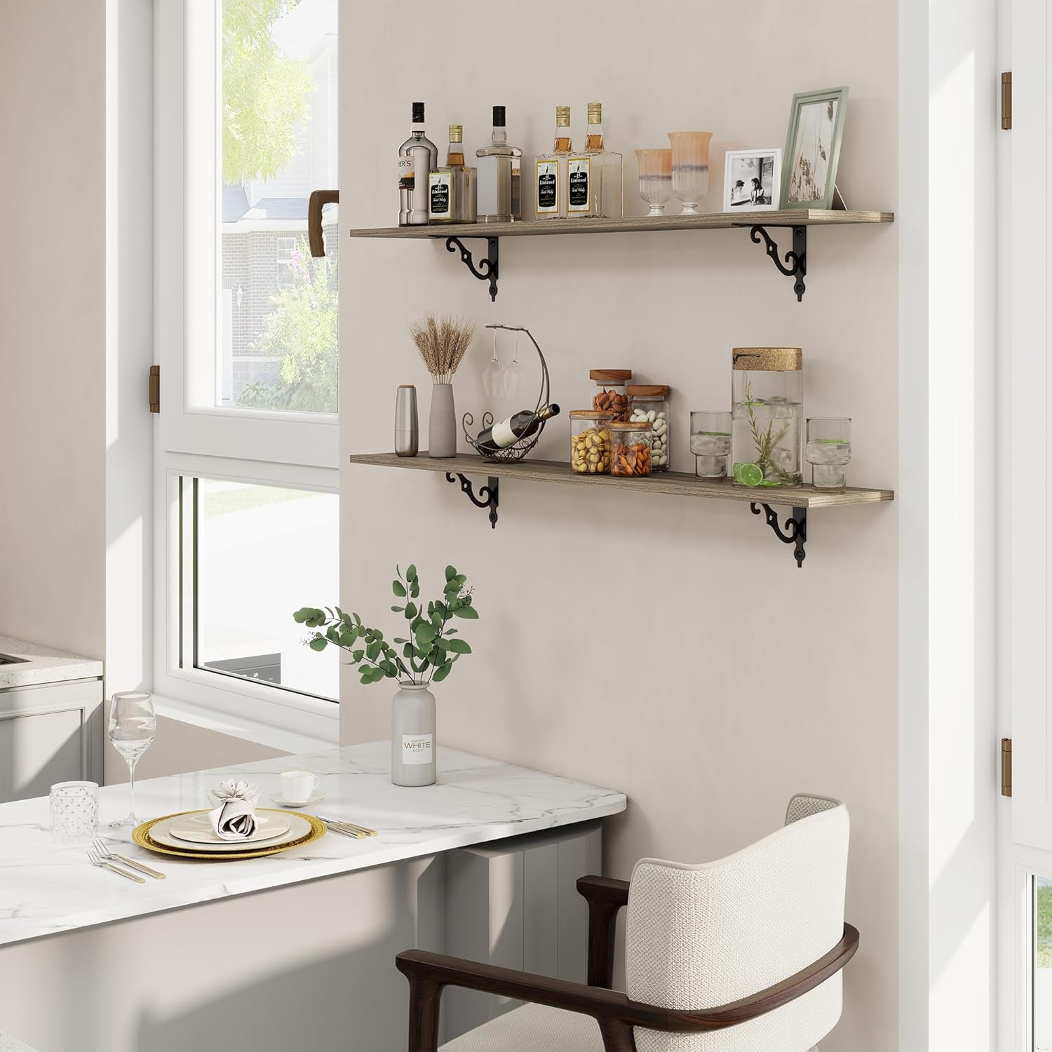 RICHFOCUS Floating Shelves for Wall Decor, 47.3W x 8D Shelves Set of 2, 8 Inch Deep Rustic Wood Shelves Wall Mounted with Brackets, Long Floating Shelves for Living Room Bedroom Kitchen, Grey