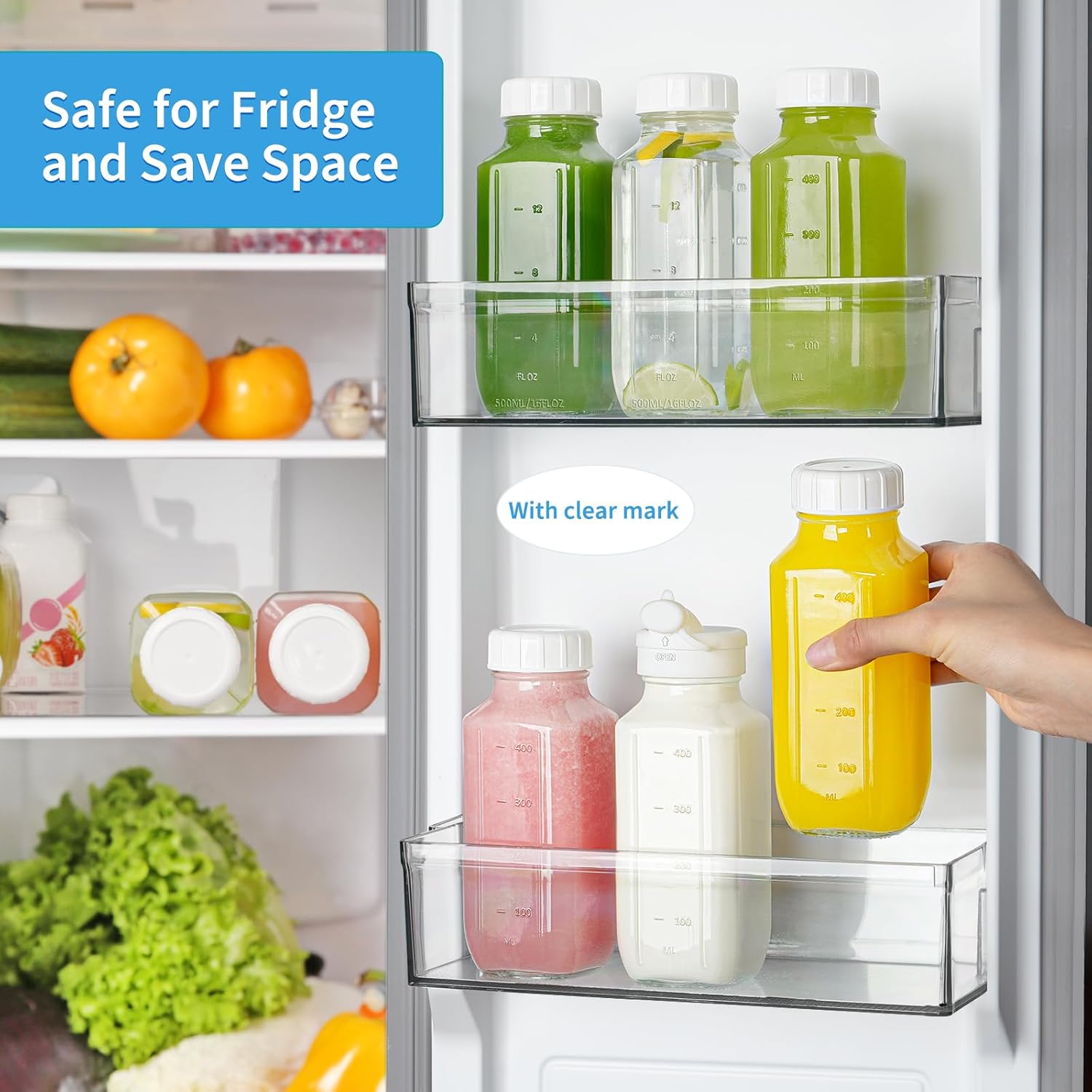 - Perfect Size: Each juice jar features: 2.65" W x 6.96" H and weighs 0.68 lbs. Its square shape is designed to provide a comfortable and easy grip and save space, fit most car cup holders and fridge doors. Wide mouth(1.3 inch) allows filling up, adding ice, and cleaning easy