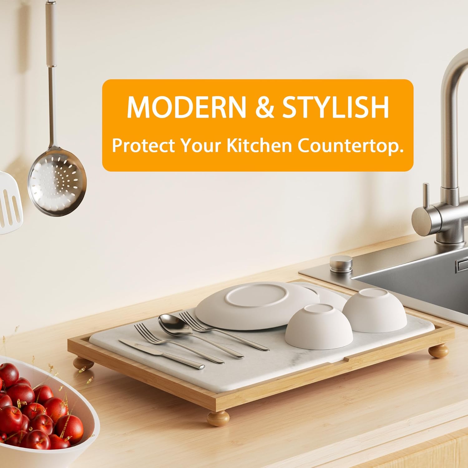 - 𝐄𝐟𝐟𝐢𝐜𝐢𝐞𝐧𝐭 𝐃𝐫𝐲𝐢𝐧𝐠 𝐏𝐨𝐰𝐞𝐫: Our stone drying mat for kitchen counter is crafted with diatomaceous earth mat and FSC-certified bamboo wood dish racks for kitchen counter, ensuring rapid absorption for your dishes. Perfect 2-in-1 dish drying mat, which is an essential addition to your kitchen accessories. Ideal for those who appreciate apartment essentials that combine functionality and style.