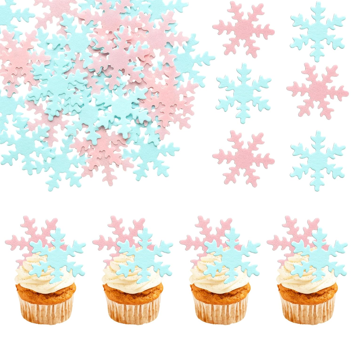 Gyufise 50Pcs Pink Edible Cupcake Cake Toppers Snowflake Cake Decorations for Christmas Winter Frozen Theme Party Supply Decoration Blue Pink