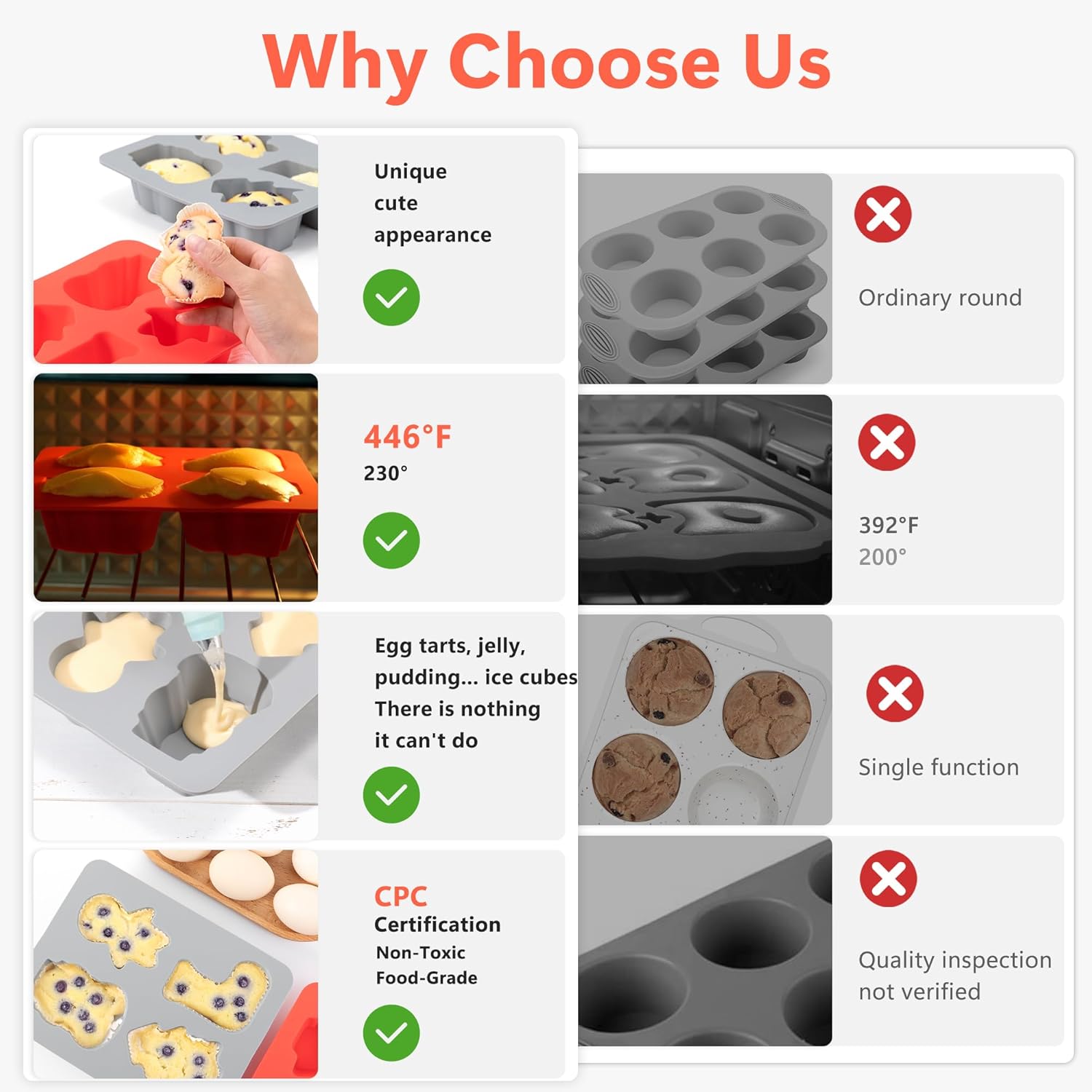 - Excellent Baking: The muffin pan is very soft, smooth and waterproof. Just push gently from the bottom of the muffin pan, the baked goods will pop out and demold smoothly, keeping its perfect shape without breaking, and the unique shape makes your baking process full of fun