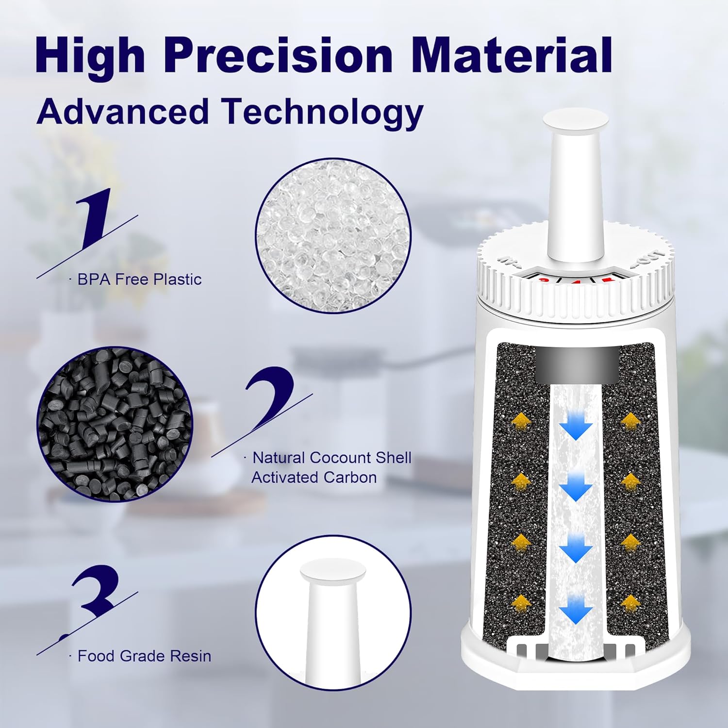 - 𝗠𝗢𝗥𝗘 𝗠𝗘𝗟𝗟𝗢𝗪 𝗔𝗡𝗗 𝗗𝗘𝗟𝗜𝗖𝗜𝗢𝗨𝗦 𝗖𝗢𝗙𝗙𝗘𝗘 - Our replacement water filter for breville espresso machine adopts advanced technology using coconut-activated carbon adsorption and ion exchange to reduce chlorine, heavy metals, and other harmful contaminants from the water for optimal flavor extraction from coffee beans. Besides, we added a non-toxic and harmless silicone pad and a finer filter to the base for better performance