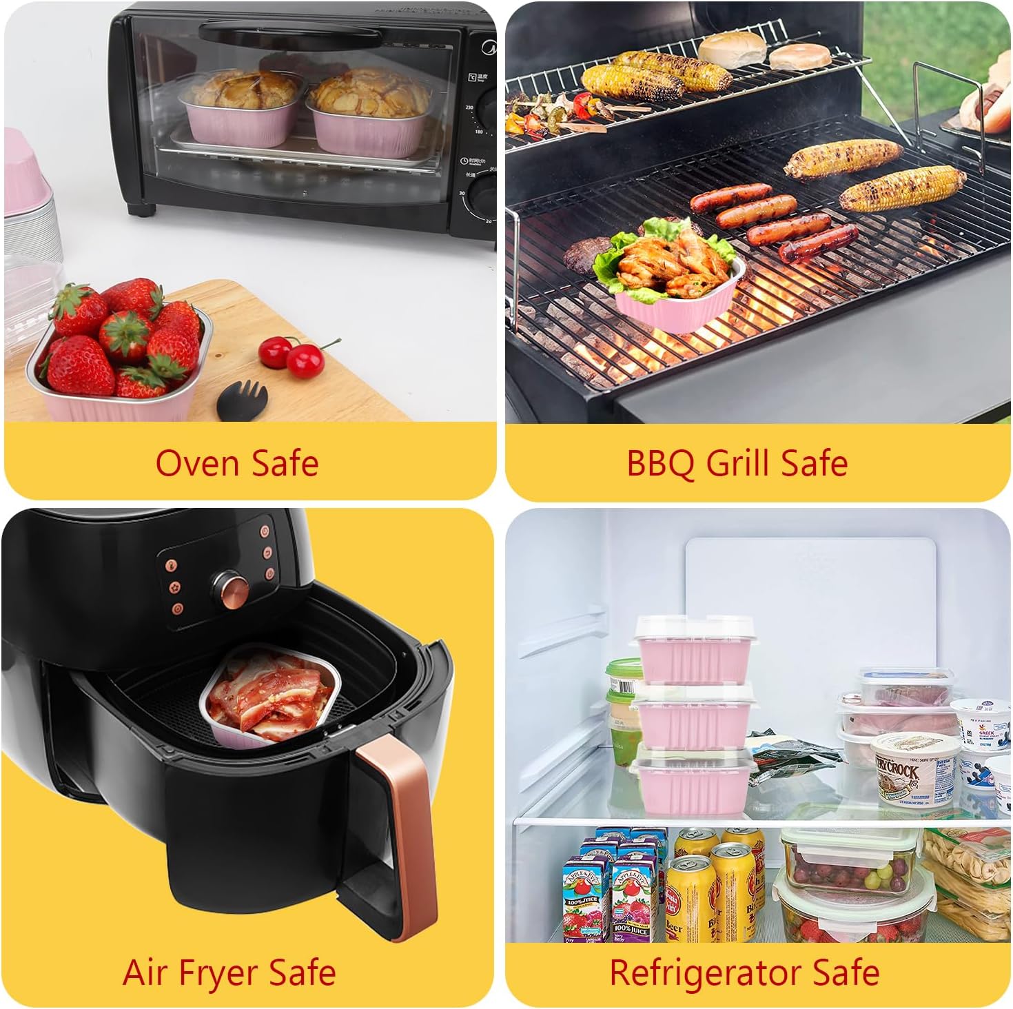 - 【No Baking Tray Needed】-These disposable mini pans are made of thicken food-grade aluminum foil,can stand well in oven.The mini cake tins are oven ,BBQ grill and air fryer safe.These mini aluminum baking pans can withstand temperatures up to 250℃/482℉,please allow cups to cool prior to applying lids. (NOTE:The clear lids are not heat resistant!)