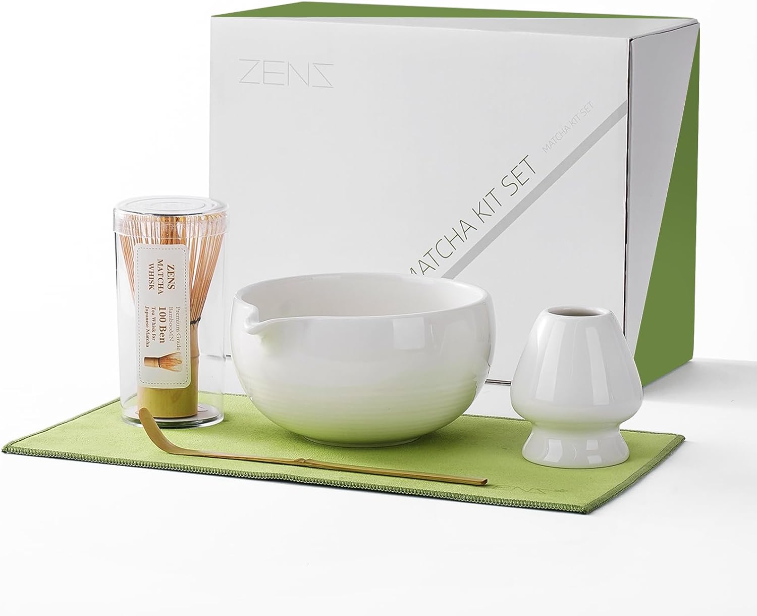 - Hand-Sprayed Glaze & Elegant Design – Inspired by traditional Japanese matcha culture, the ZENS matcha whisk set features a beautifully hand-sprayed gradient green glaze, blending Matcha art with aesthetic appeal. The naturally fresh green ceramic bowl and absorbent tea towel complete the perfect matcha ceremony experience.