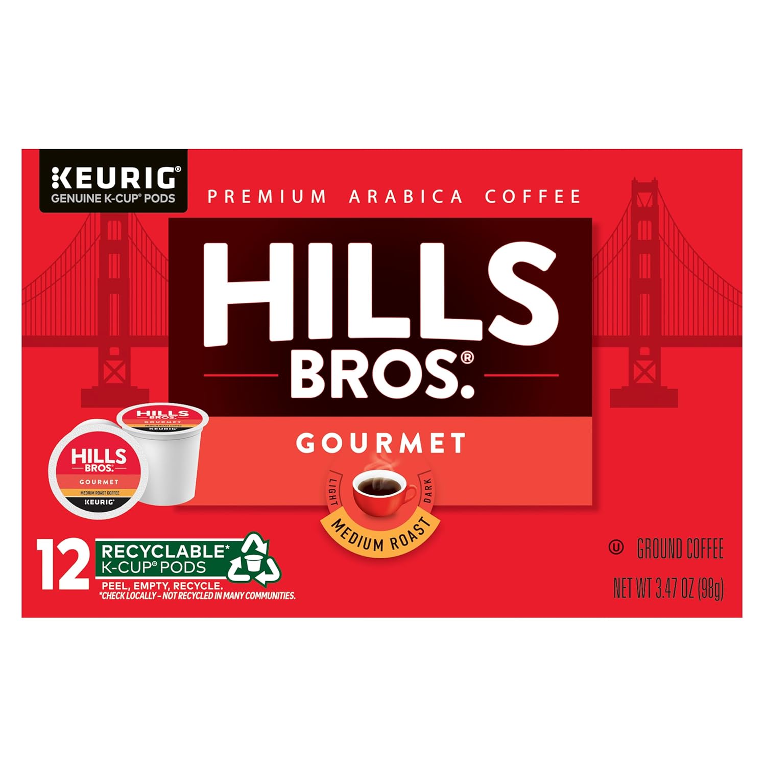 Hills Bros. Gourmet Blend Keurig K-Cup Pods for Keurig Brewers – Medium Roast Premium Arabica Blend, Kosher – 1 Pack of 12 Single Serve Pods