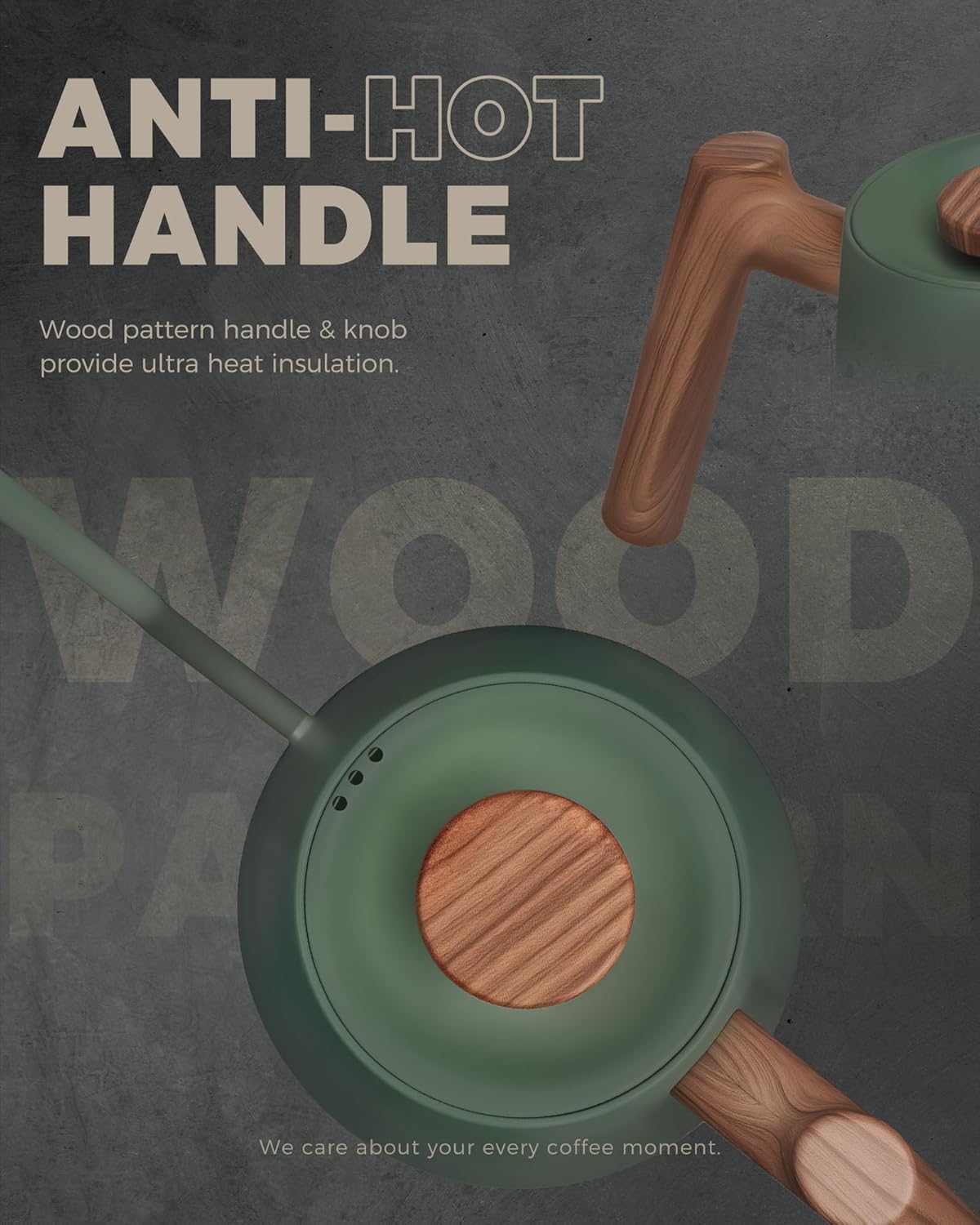 - STYLISH DESIGN WITH WOOD PATTERN HANDLE: This 34oz tea kettle features an ergonomic wood grain heat-resistant handle for comfortable pouring, alongside an easy-to-read LED display that shows real-time temperature readings, ensuring precise brewing without guesswork.