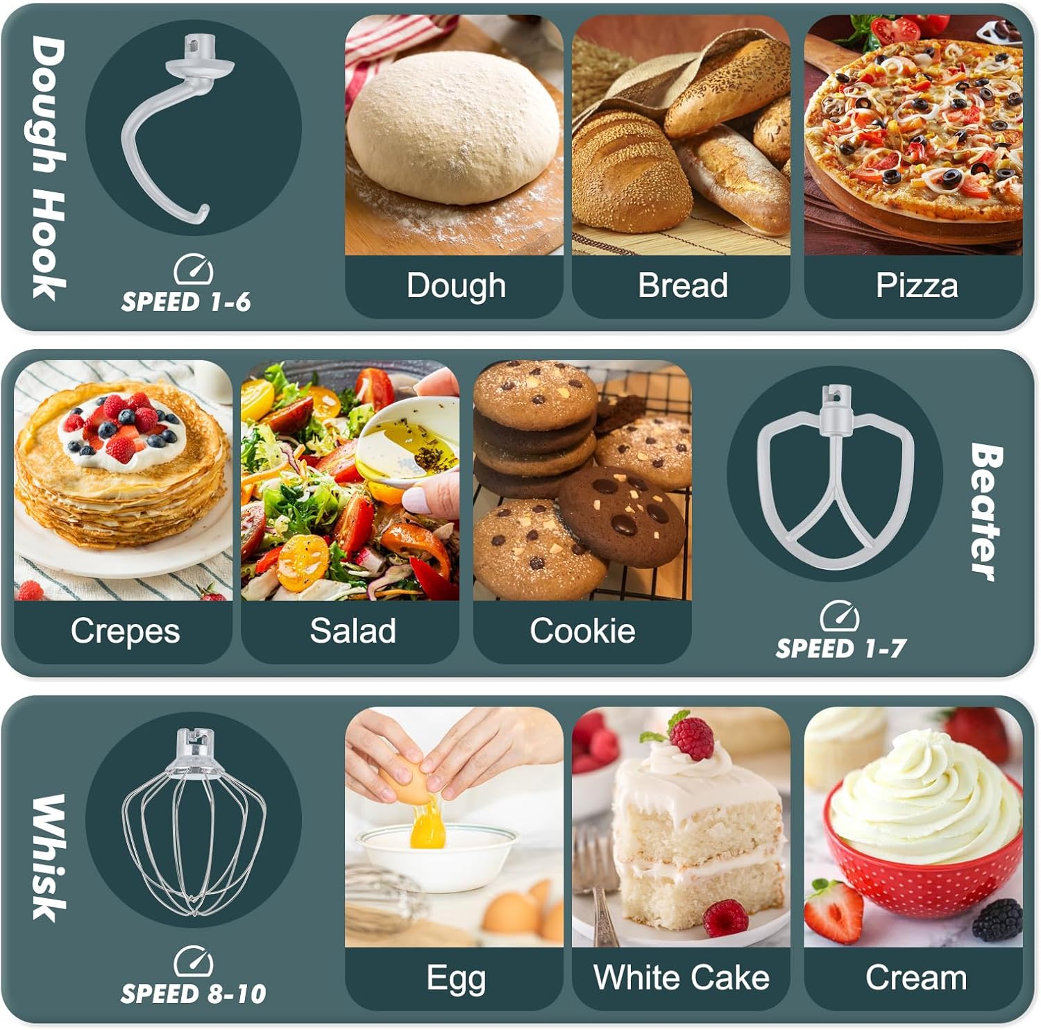 - Upgraded Accessories and Dishwasher Safe- Aluminium dough hook and flat beater with protection layer,stainless steel whisk are all easy to attach,more sturdy and durable. The stainless steel bowl and all accessories are dishwasher-safe for effortless cleanup.