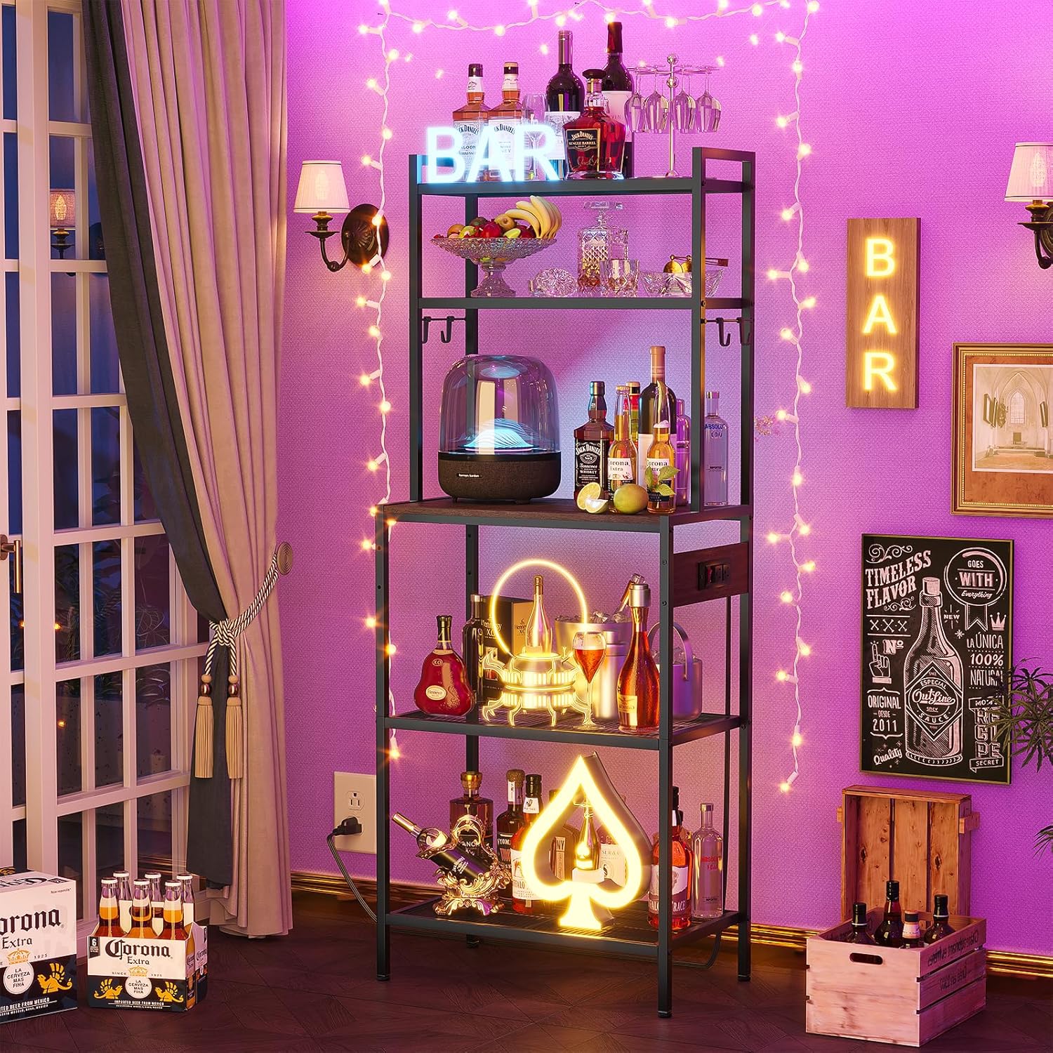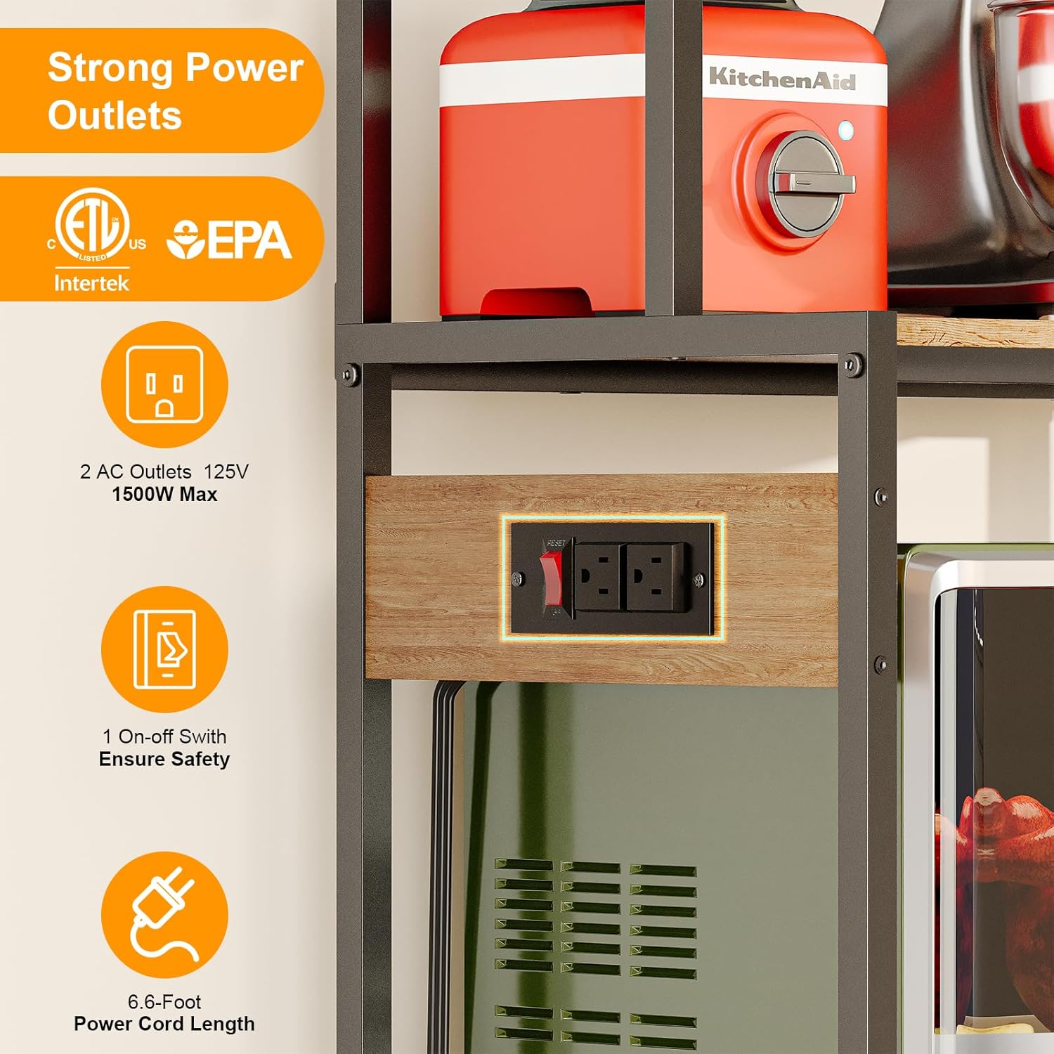 S1 Kitchen Bakers Rack with Power Outlet, Microwave Stand with Storage 5-Tiers, Freestanding Coffee Bar Table with 4 Hooks, Kitchen Storage Shelf 13" D x 22.9" W x 58.3" H, Rustic Brown