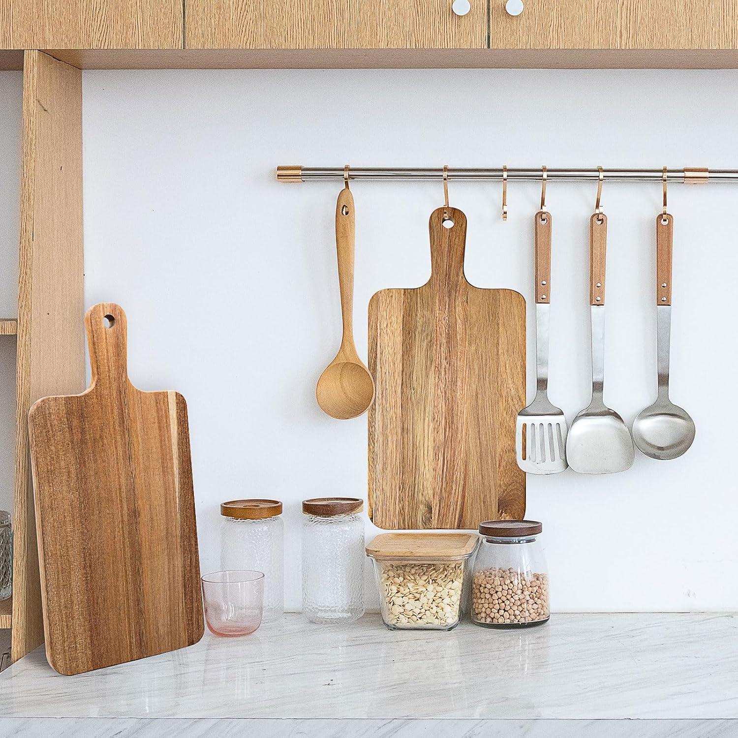 - Handle with Hanging Hole: This wooden cutting board is designed with a handle, easy to take; There is a round hole on the top, you can hang it with rope at will for home decoration