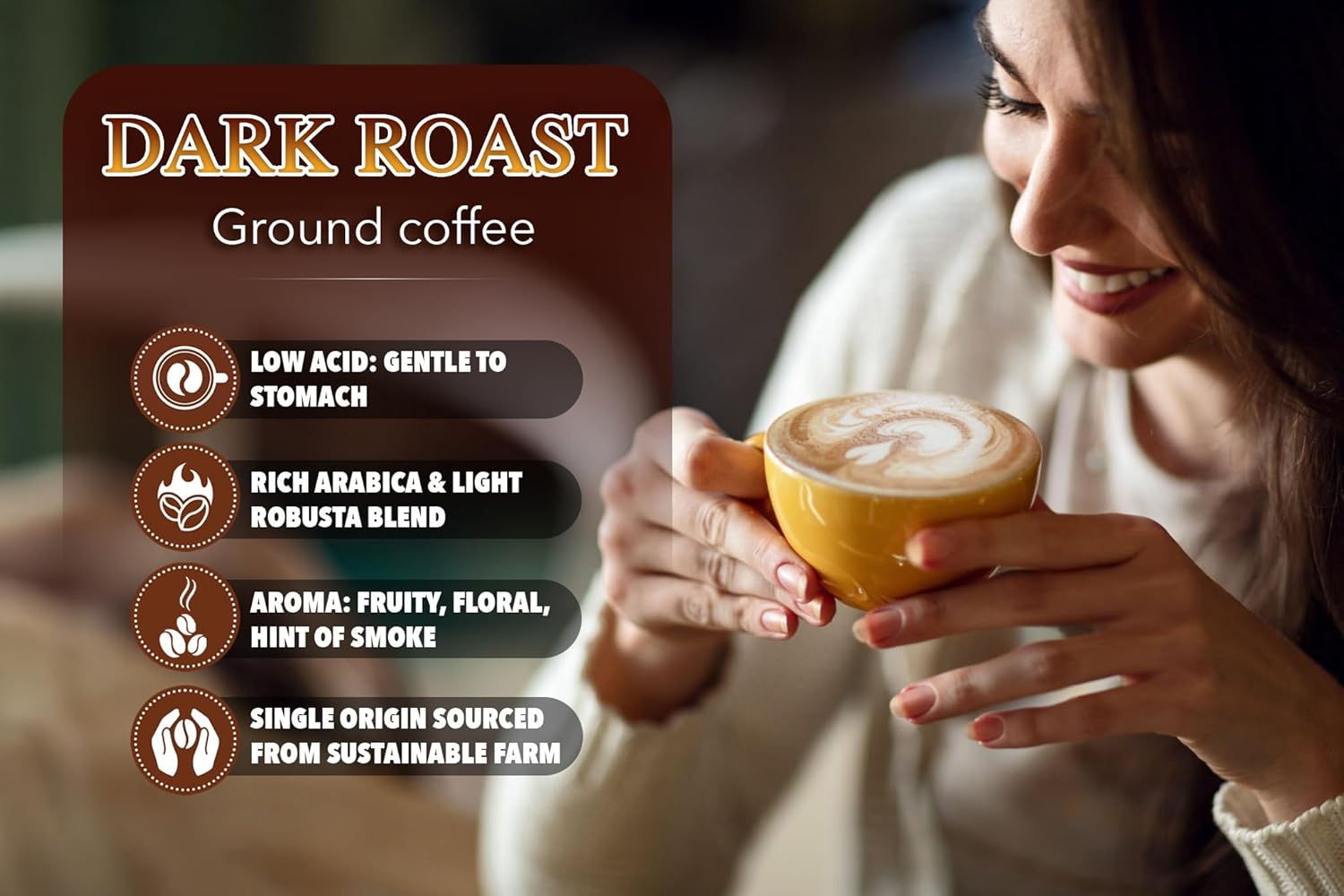 - LOW ACID COFFEE, DARK ROAST - Gentle On Stomach: Grown at 5,200 feet in Vietnam’s cool highlands, where alkaline-rich volcanic soil slows bean maturation and naturally lowers acidity. With its deep roasting process, ground coffee dark roast has lower acidity than lighter roasts, making it gentler on your stomach while still providing that rich coffee flavor. It is perfect for those who prefer a bold, smoky, and intense flavor with acid sensitive stomach and digestive issues