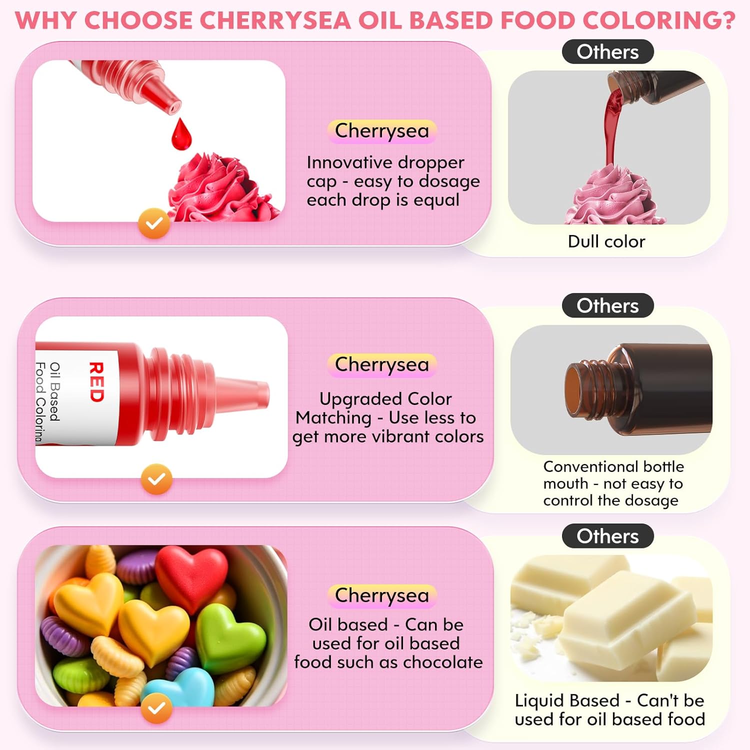 - Best Oil Based Baking Food Coloring Set - Different from water-soluble and gel based food dye, this oil-based based is specially designed for chocolate, butter, mousse, and candy.