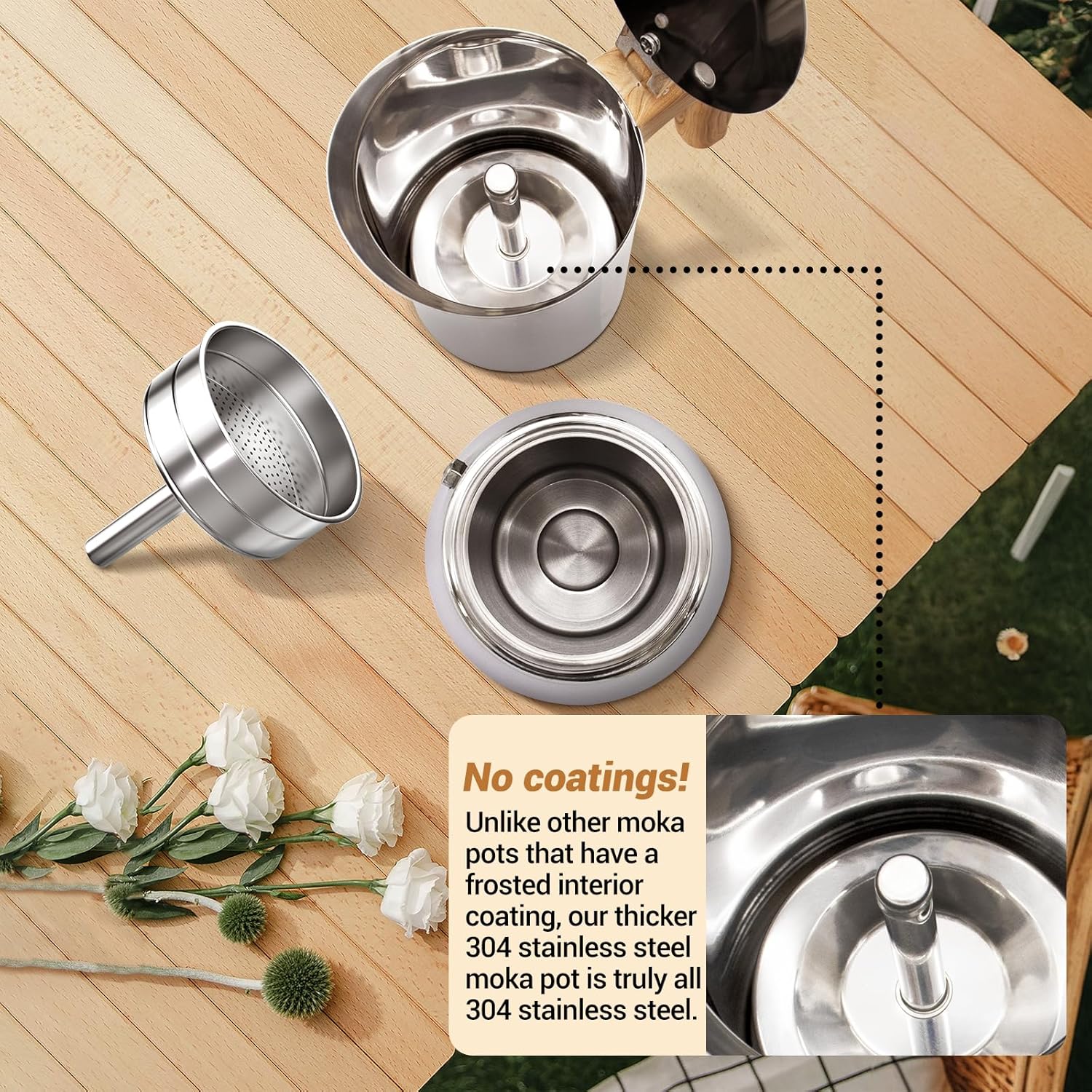 - Exceptional 304 Stainless Steel: Stainless steel is sturdy and durable,not easy to be deformed or damaged,and can withstand prolonged use and repeated cleaning,which prolongs the service life of the mocha pot and makes it able to accompany you for a longer period of time.Unlike other moka pots that have a frosted layer on the inside,you can see that this moka pot of ours is truly made of all stainless steel.It has a stainless steel lower pot interior and upper pot lining