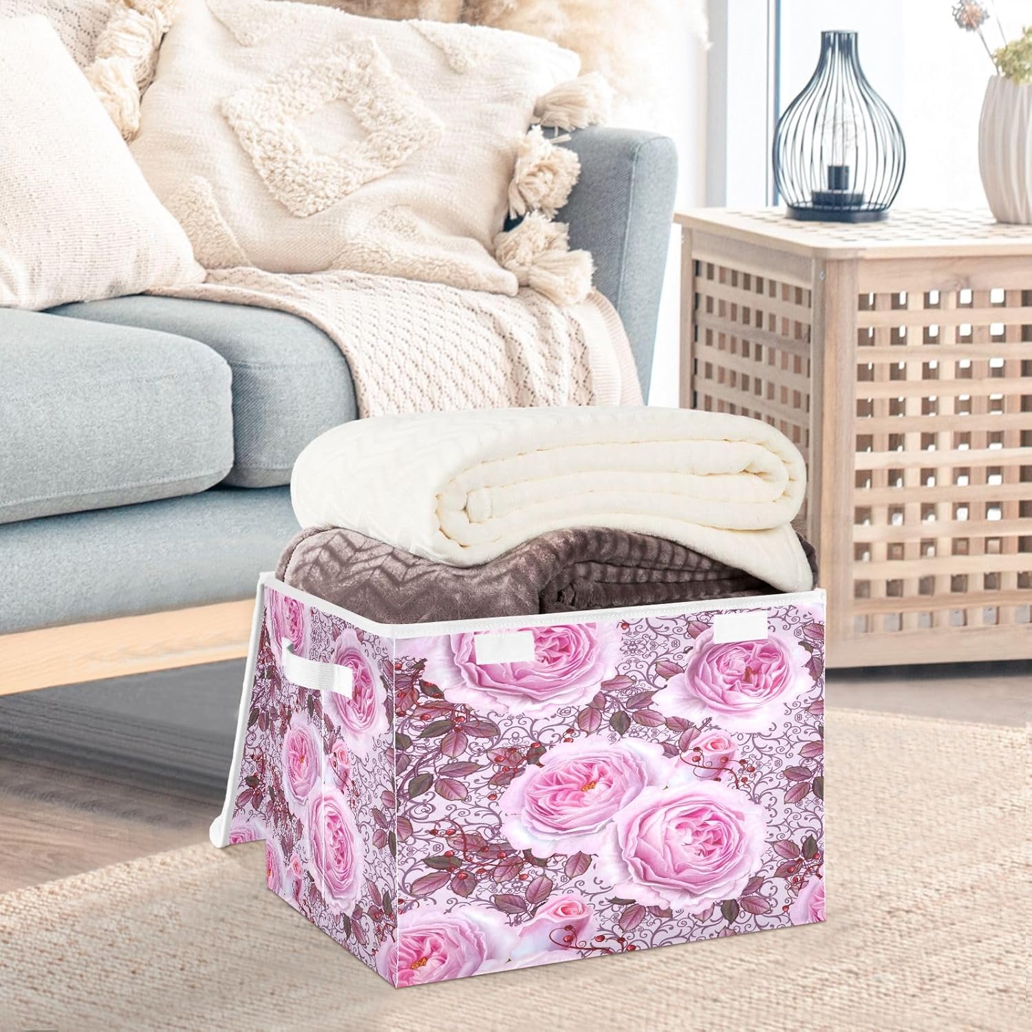 susiyo Beautiful Delicate Pink Roses fabric storage baskets with lids,Collapsible Storage Boxes,Foldable storage boxes with handles for Home,Office,Closet Organization