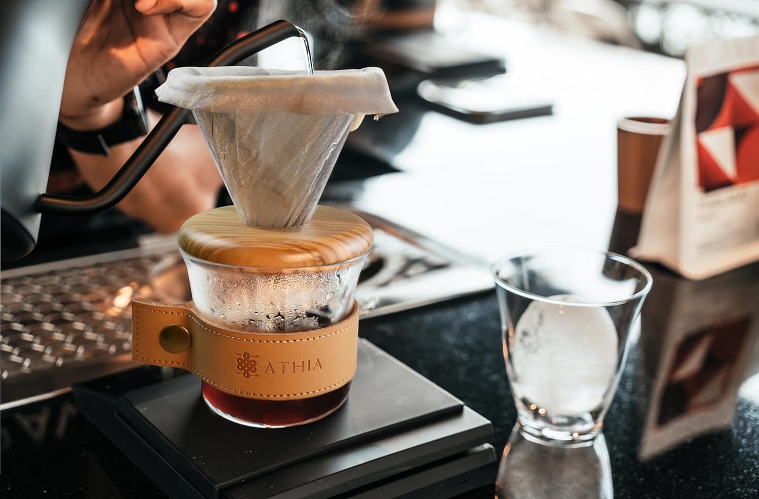ATHIA glass pour over coffee maker set, minimalist drip coffee maker with reusable cloth filter, glass coffee dripper, olive lid & leather sleeve for single cup manual brewing (Olive Wood)