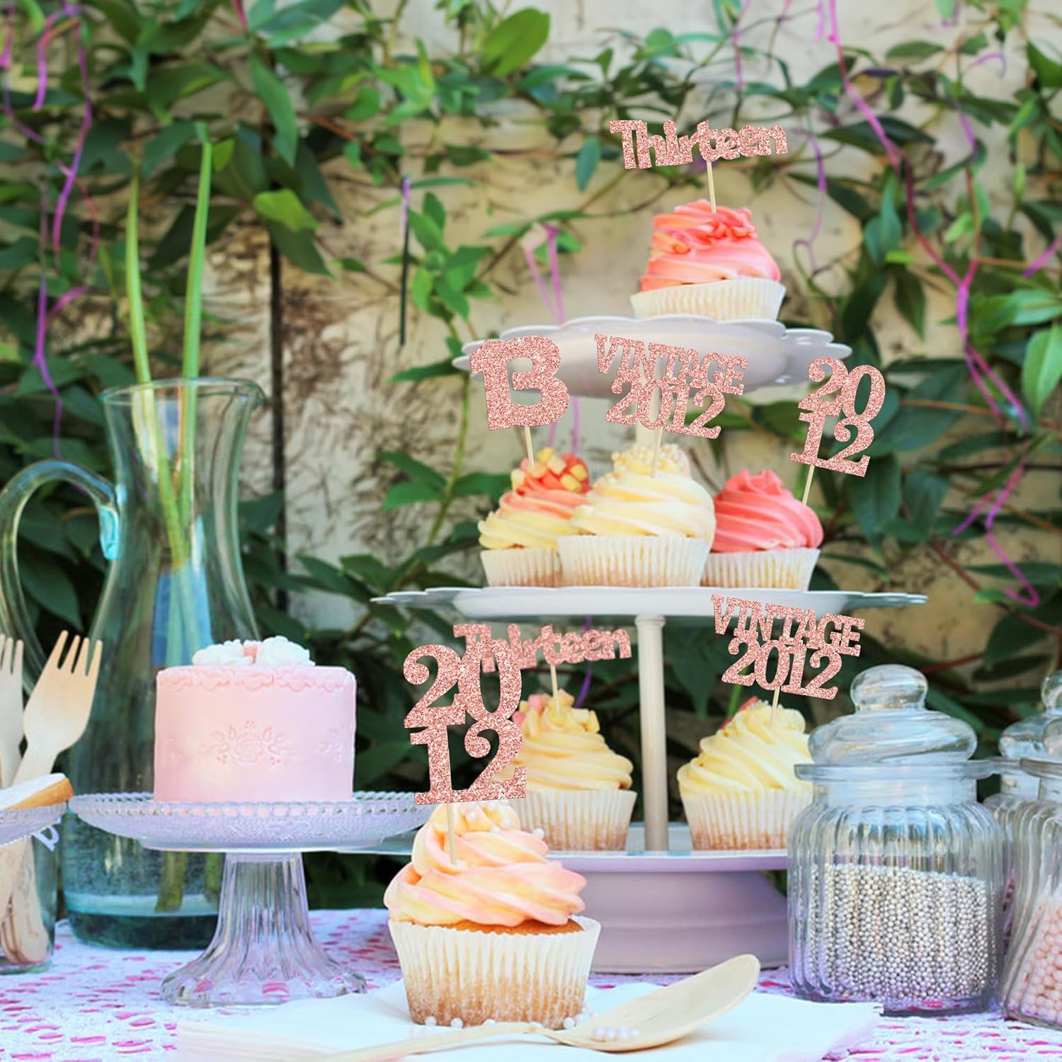 Gyufise 24Pcs 13th Birthday Cupcake Toppers Glitter Thirteen Vintage 2012 Hello 13 Years Birthday Cupcake Picks Official Teenager 13 Cake Decor for Happy 13th Anniversary Party Rose Gold