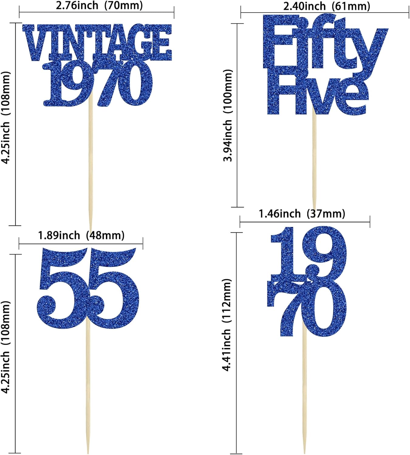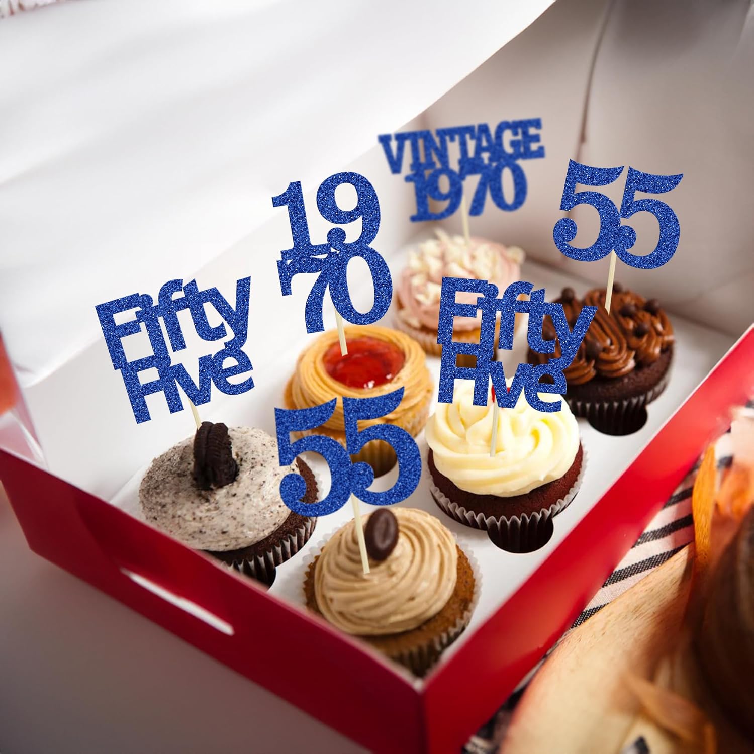 Gyufise 24Pcs Vintage 1970 Cupcake Toppers Glitter Cheers to 55 Fabulous Fifty Five Cupcake Picks 55th Birthday Wedding Anniversary Party Cake Decorations Supplies Deep Blue