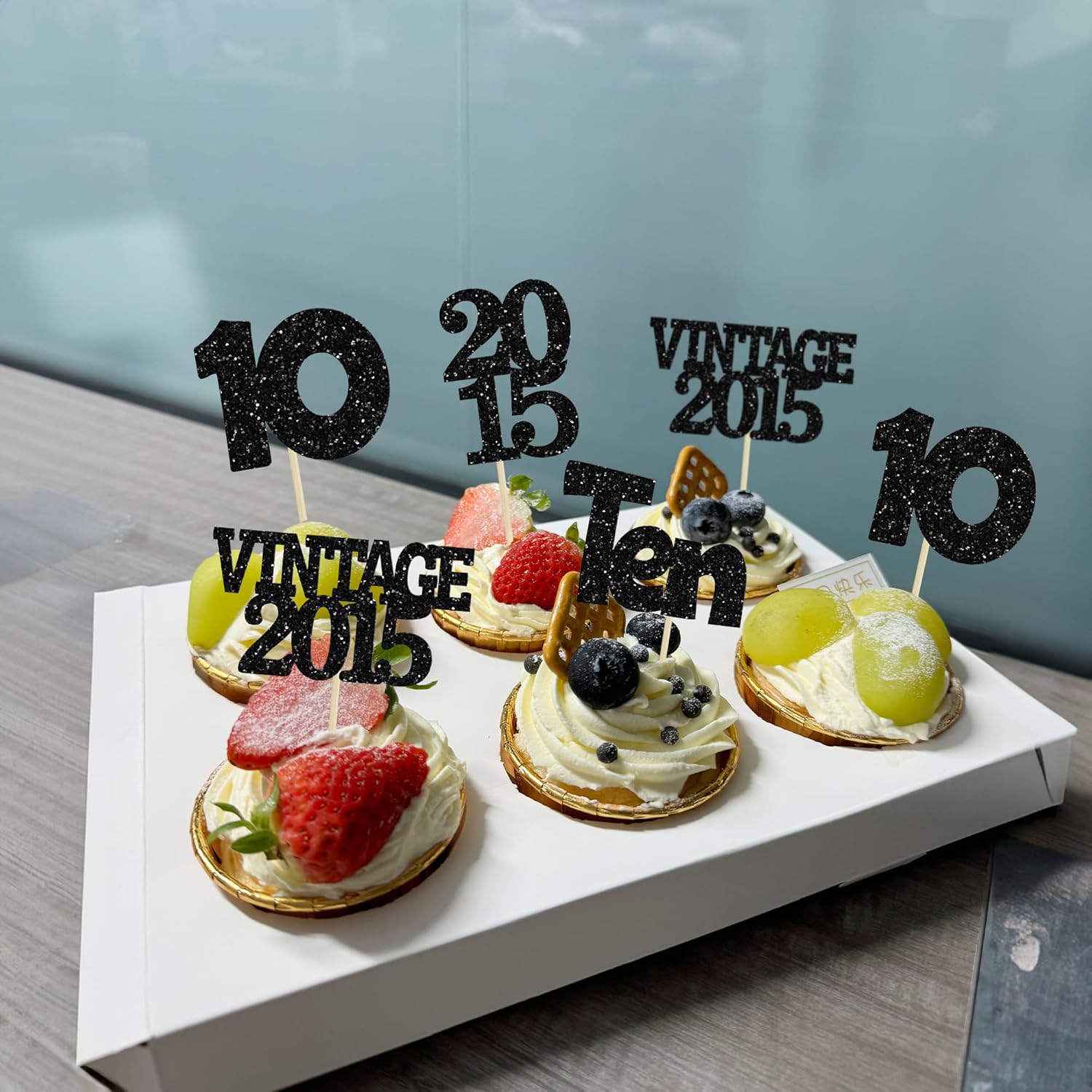 Gyufise 24Pcs 10th Birthday Cupcake Toppers Glitter Ten Vintage 2015 Double Digits 10 Cupcake Picks Hello 10 Years Birthday Cake Decorations for Happy 10th Anniversary Party Supplies Black