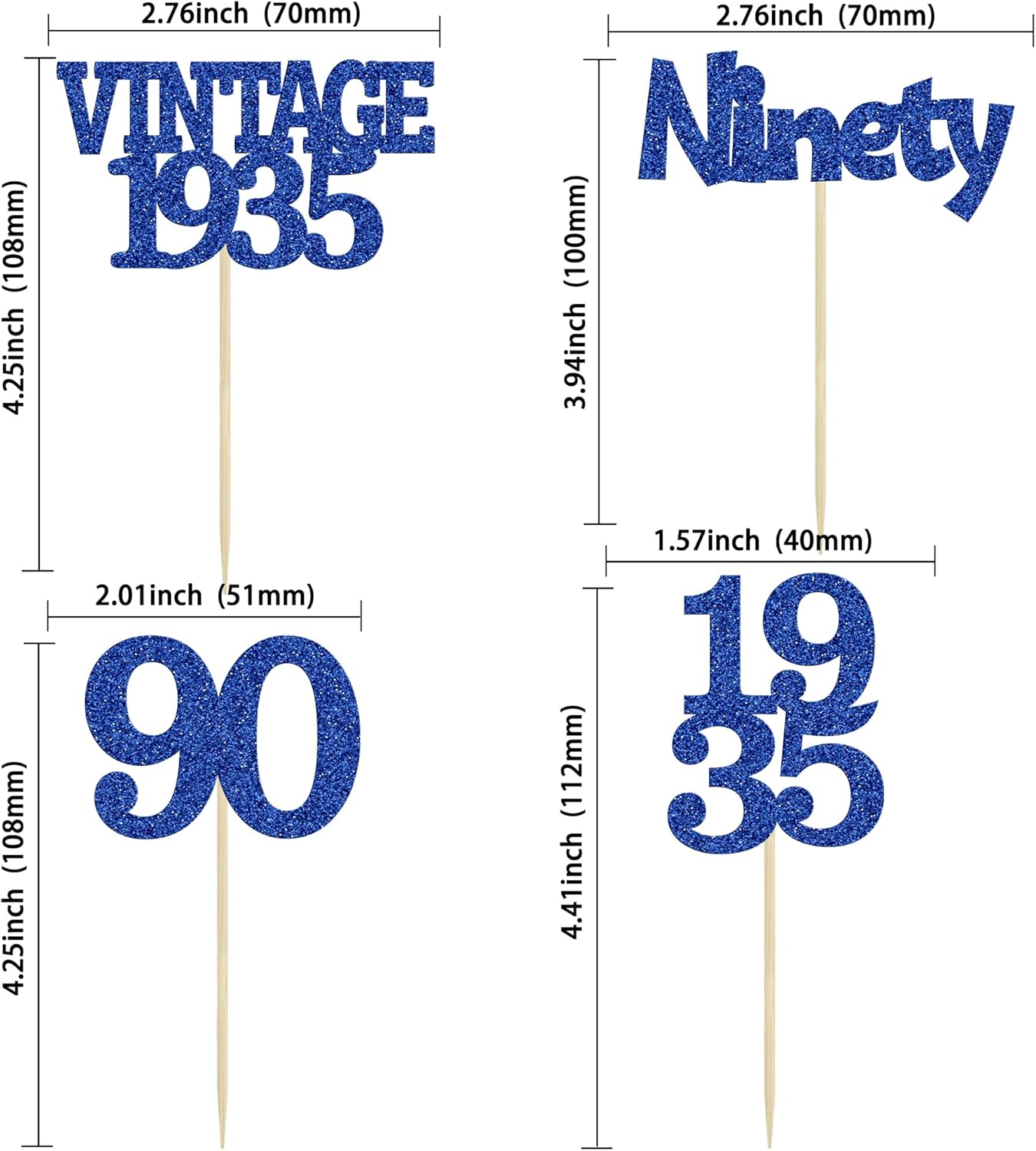 Gyufise 24Pcs Vintage 1935 Cupcake Toppers Glitter Cheers to 90 Fabulous Ninety Cupcake Picks 90th Birthday Wedding Anniversary Party Cake Decorations Supplies Deep Blue