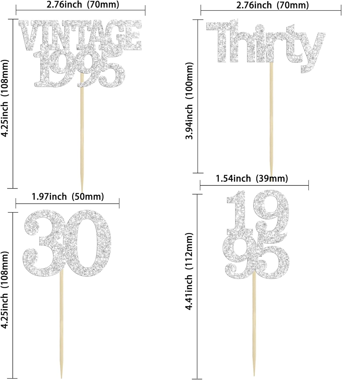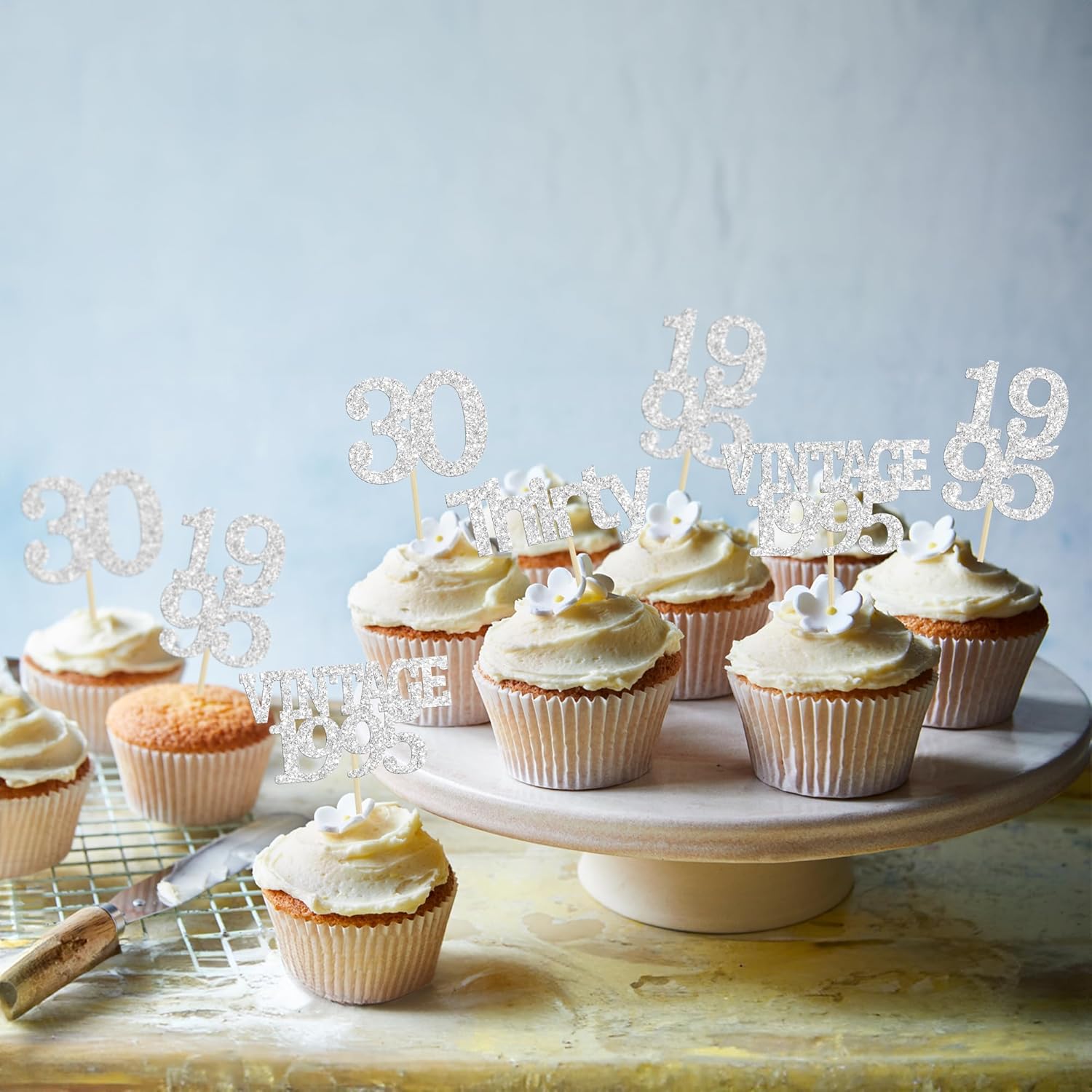 Gyufise 24Pcs Happy 30th Birthday Cupcake Toppers Glitter Thirty 30 Fabulous Vintage 1995 Cupcake Picks for 30th Birthday Wedding Anniversary Party Cake Decorations Supplies Silver
