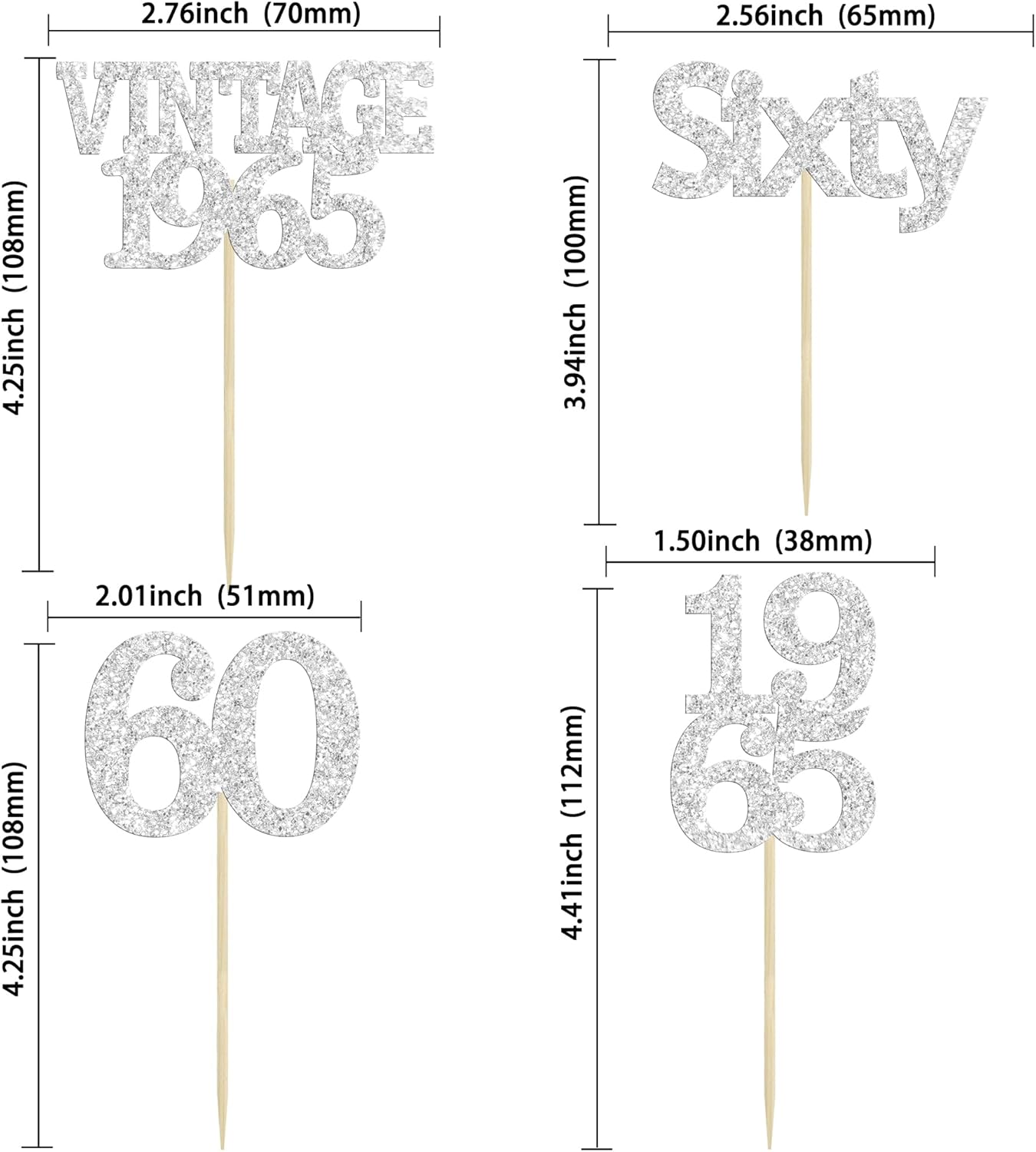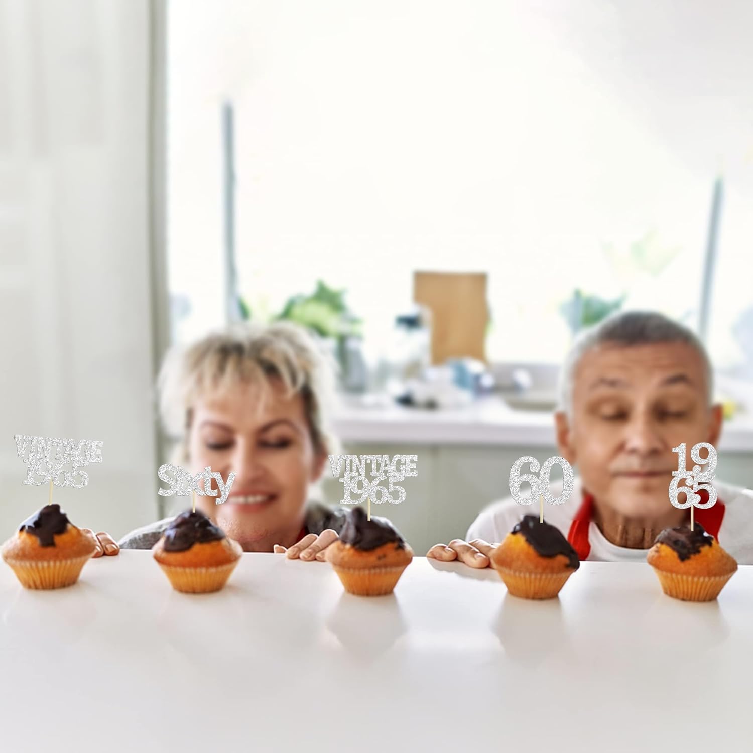 Gyufise 24Pcs 60th Birthday Cupcake Toppers Cheers to 60 Fabulous Sixty Cupcake Picks Vintage 1965 Decorations for 60th Birthday Wedding Anniversary Party Cake Decorations Supplies Silver